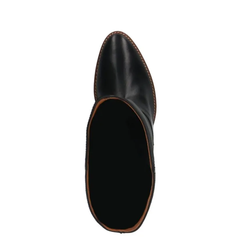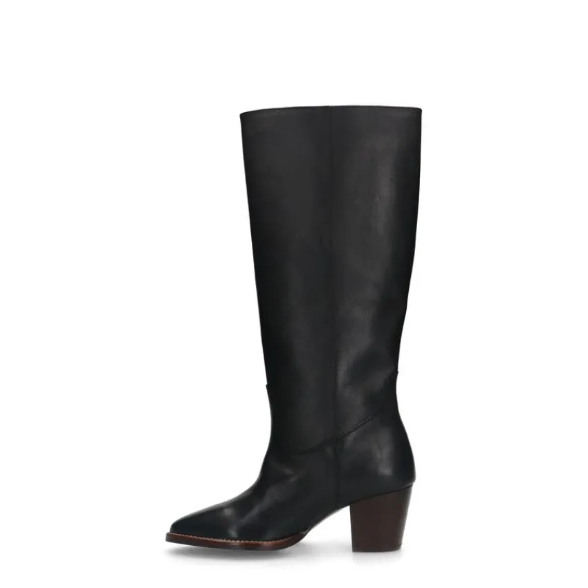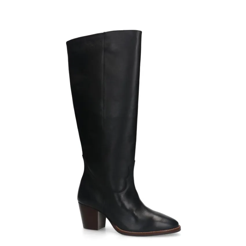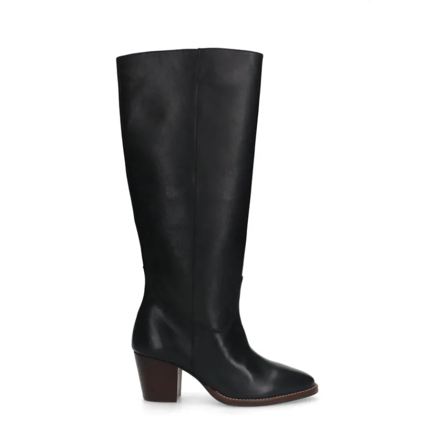 Zwarte leren hoge laarzen met hak van Manfield. De blokhak is 6 cm hoog, de schachtomtrek is 38 cm en de schachthoogte is 34 cm. We adviseren als verzorging en bescherming de Collonil Carbon Pro.