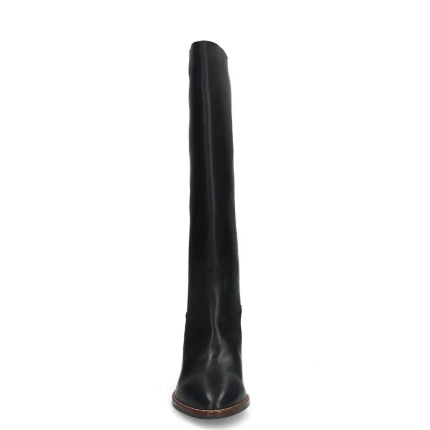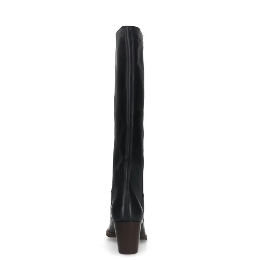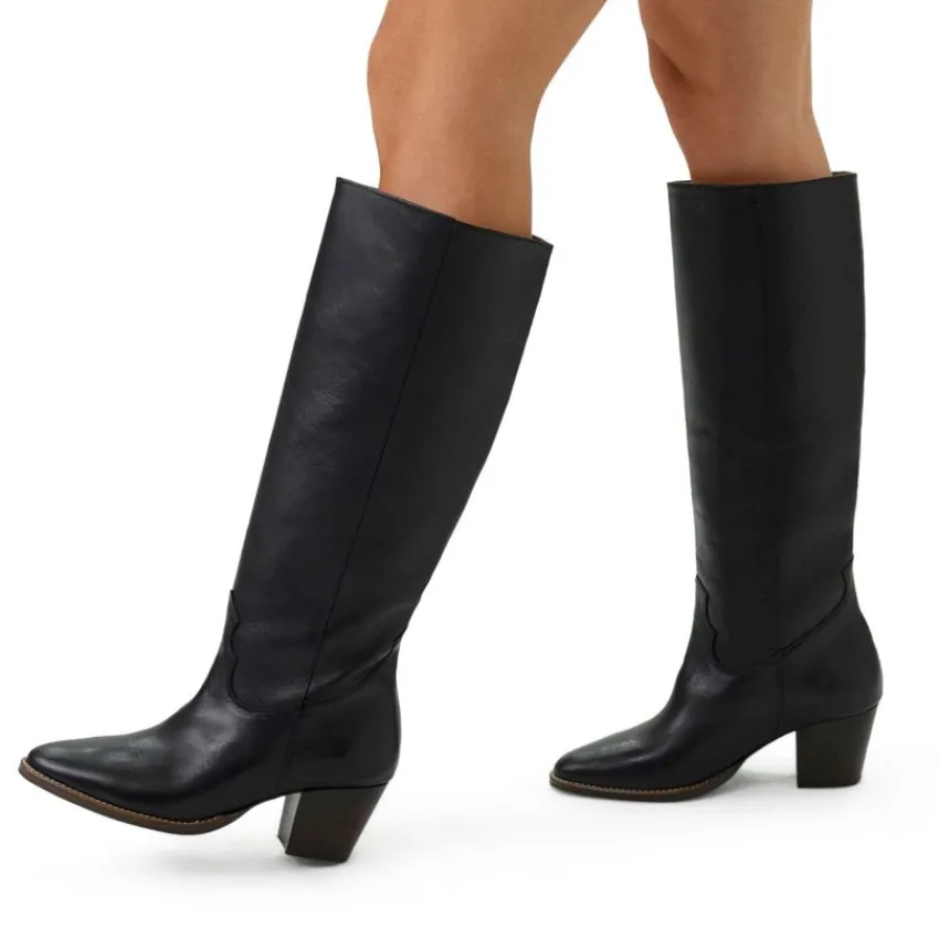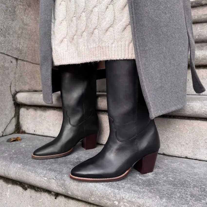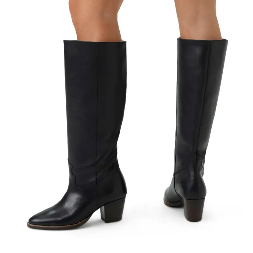 Zwarte leren hoge laarzen met hak van Manfield. De blokhak is 6 cm hoog, de schachtomtrek is 38 cm en de schachthoogte is 34 cm. We adviseren als verzorging en bescherming de Collonil Carbon Pro.