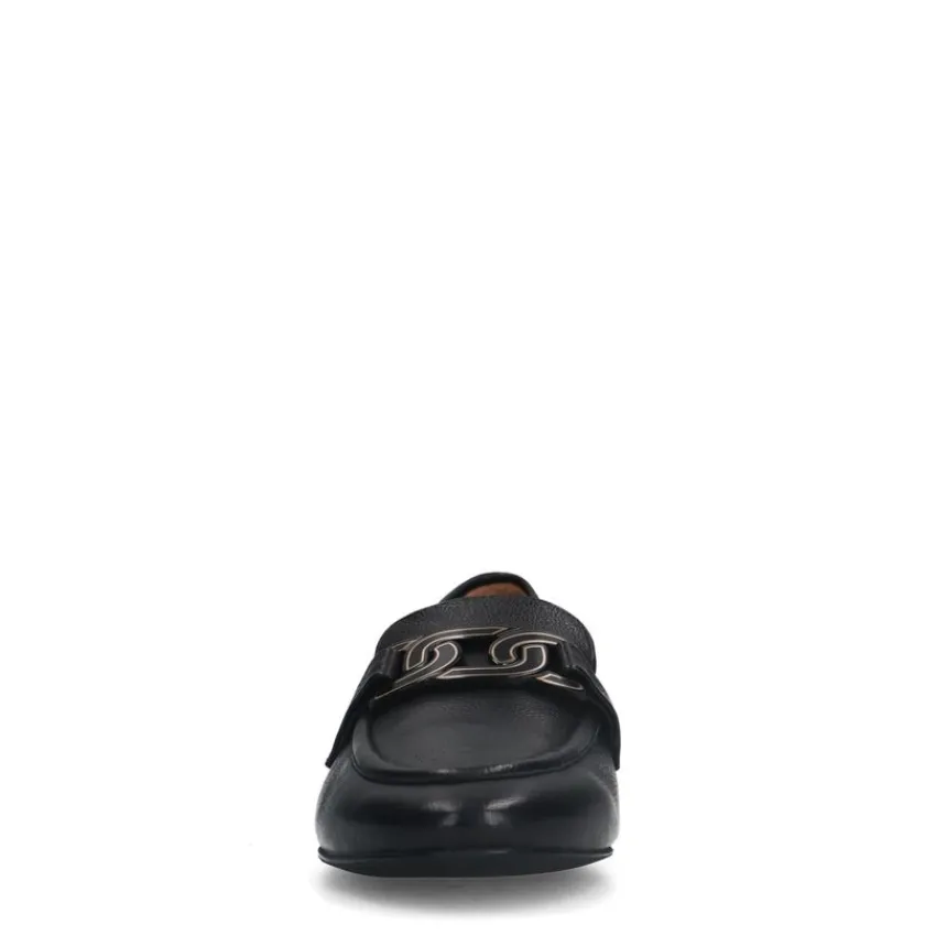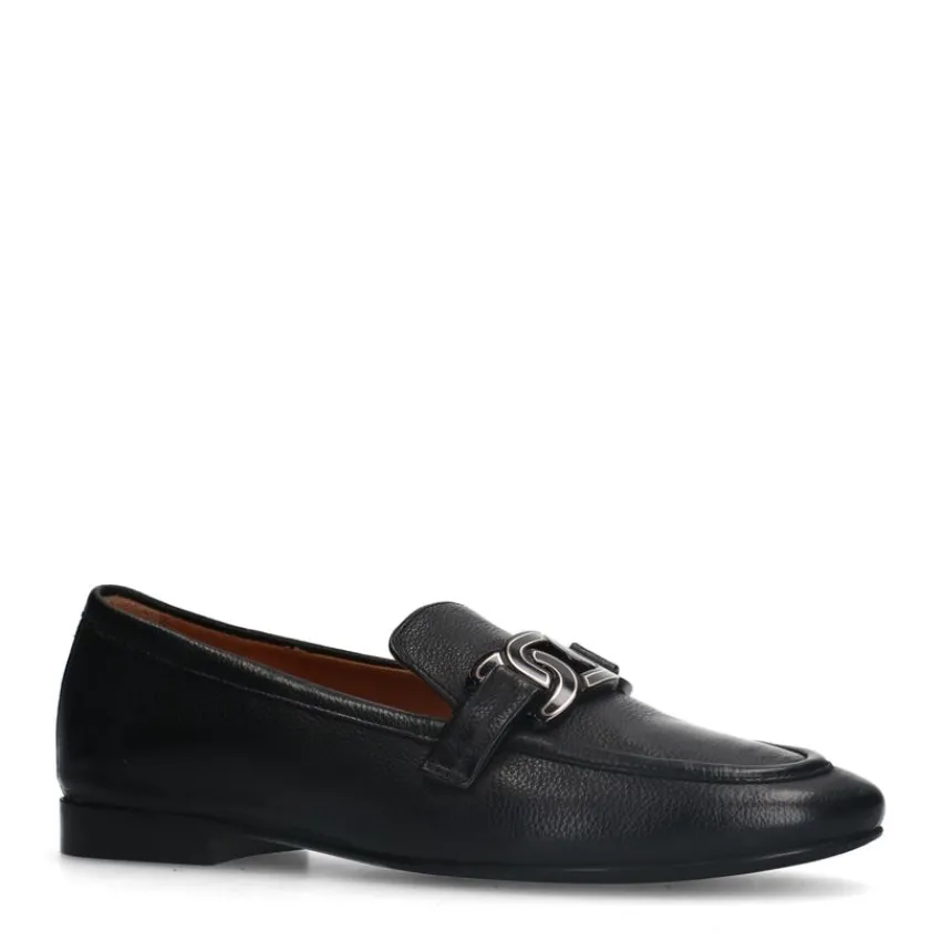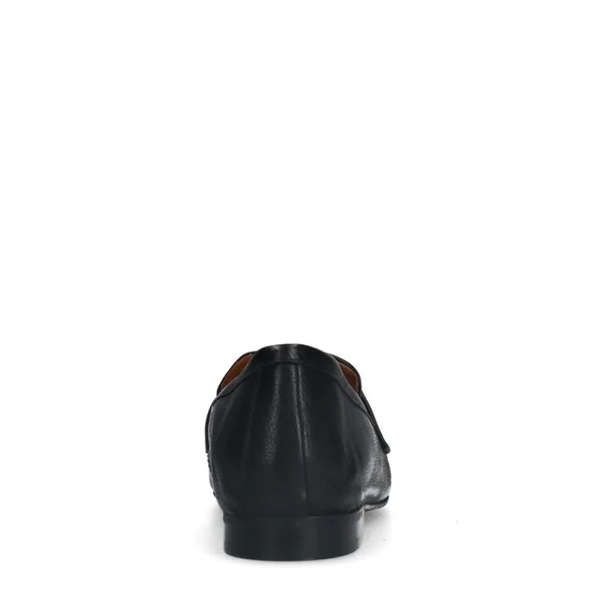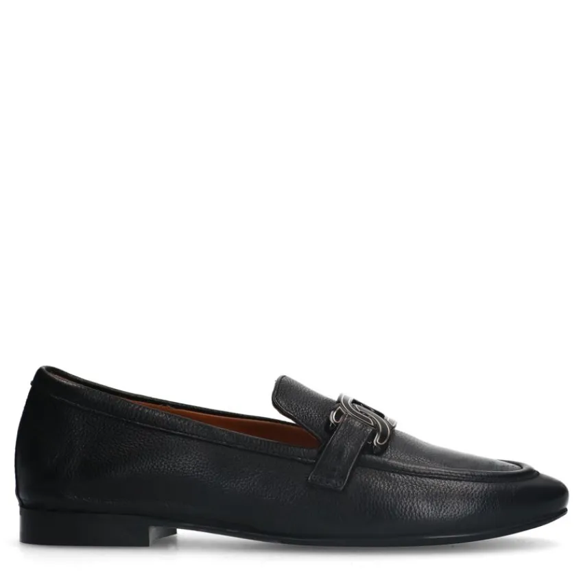Zwarte leren loafers van Manfield, met zwart detail op de voorvoet en platte hak van 1 cm. We adviseren als verzorging en bescherming de Collonil metallic spray.
