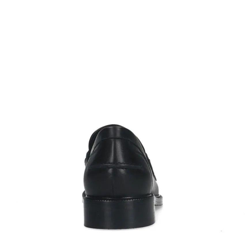 Zwarte leren loafers met goudkleurige chain van Manfield. De loafers hebben een platte hak van 2 cm. We adviseren als verzorging en bescherming de Collonil Carbon Pro.