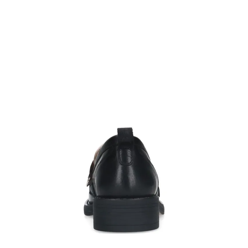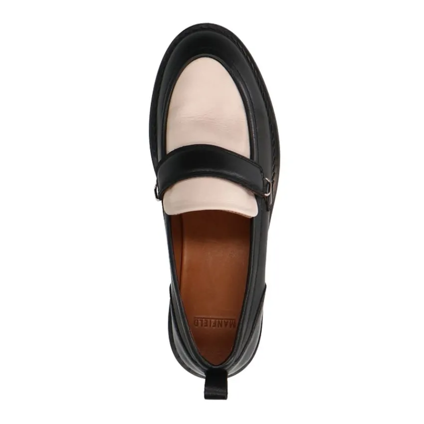 Zwarte leren loafers met witte details van Manfield. De loafers hebben een platte hak van 2 cm. We adviseren als verzorging en bescherming de Collonil Carbon Pro.