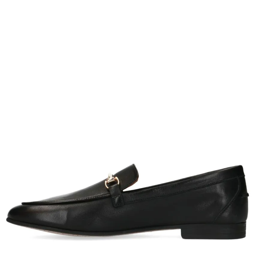 Zwarte leren loafers van Manfield met platte hak van 2 cm en goudkleurige detail op de voorvoet. We adviseren als verzorging en bescherming de Collonil Carbon Pro.