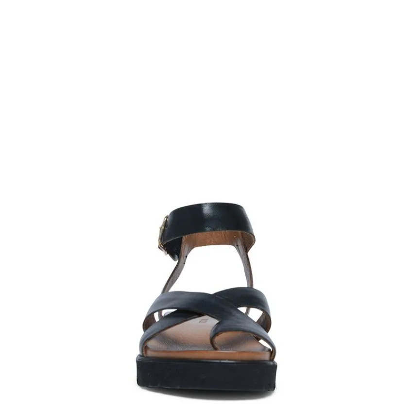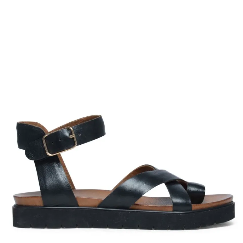 Zwarte leren plateau sandalen met gespsluiting van Manfield. De sandalen hebben een plateau van 2 cm, we adviseren als verzorging en bescherming de Collonil Carbon Pro.