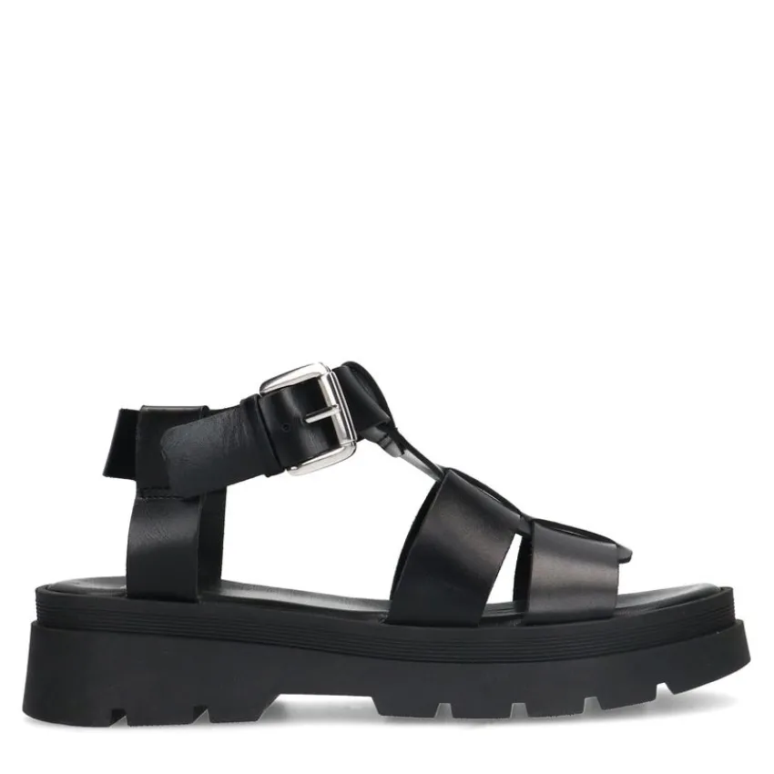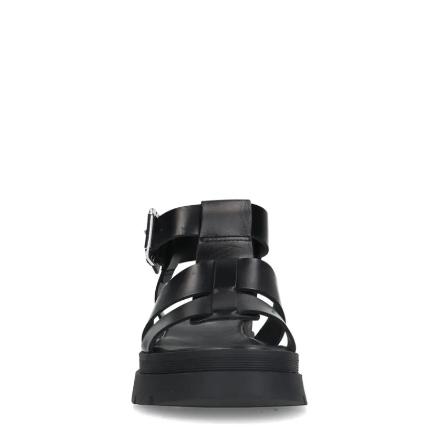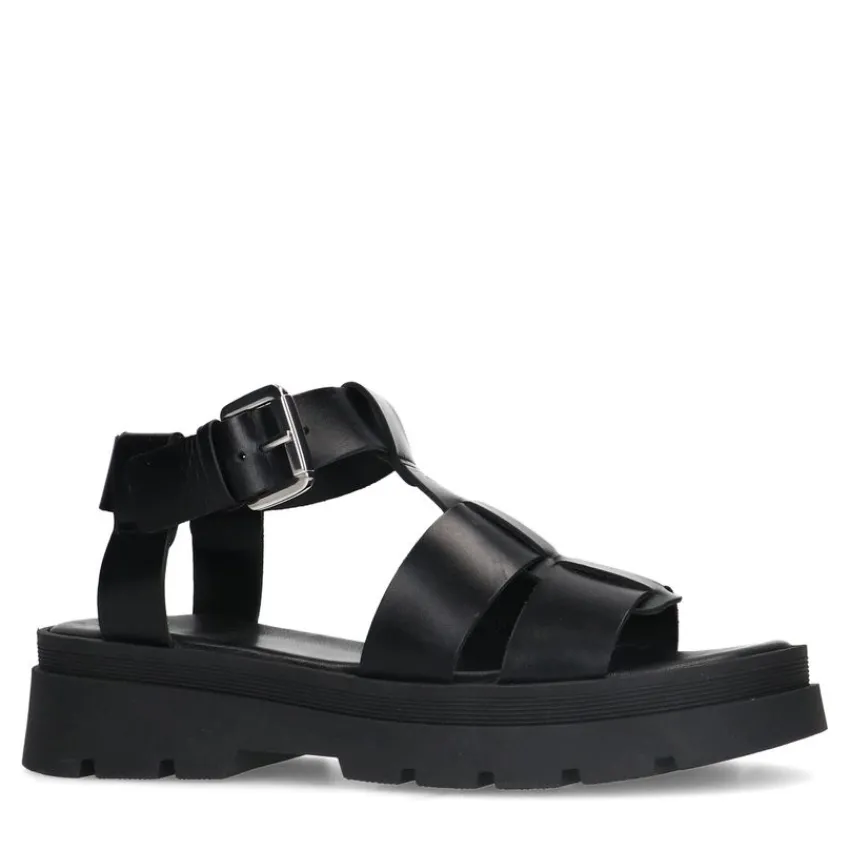Zwarte leren sandalen van Manfield met chunky zool van 3 cm en gespsluiting rondom de enkels. We adviseren als verzorging en bescherming de Collonil Carbon Pro.