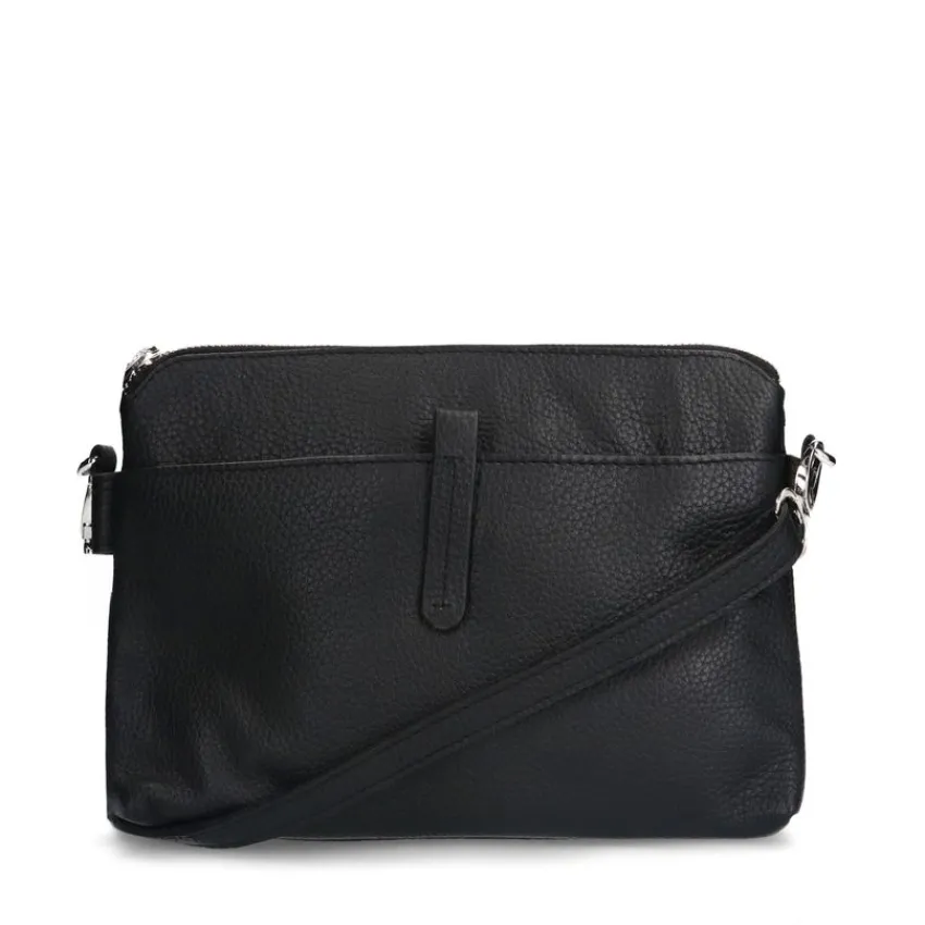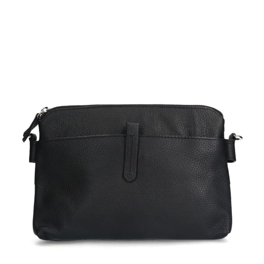 Zwarte leren schoudertas van Manfield met dubbele ritssluiting en verstelbare band van 115 cm. De afmeting van de tas is 26x18x7 cm (BxHxD).