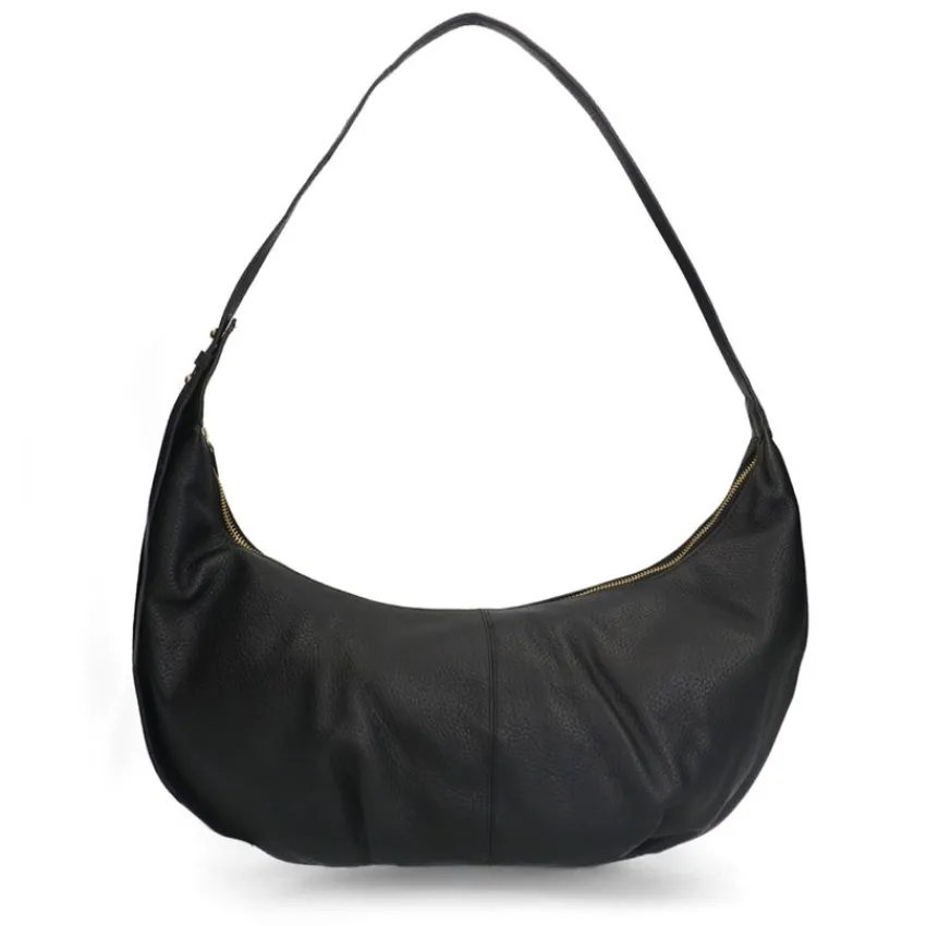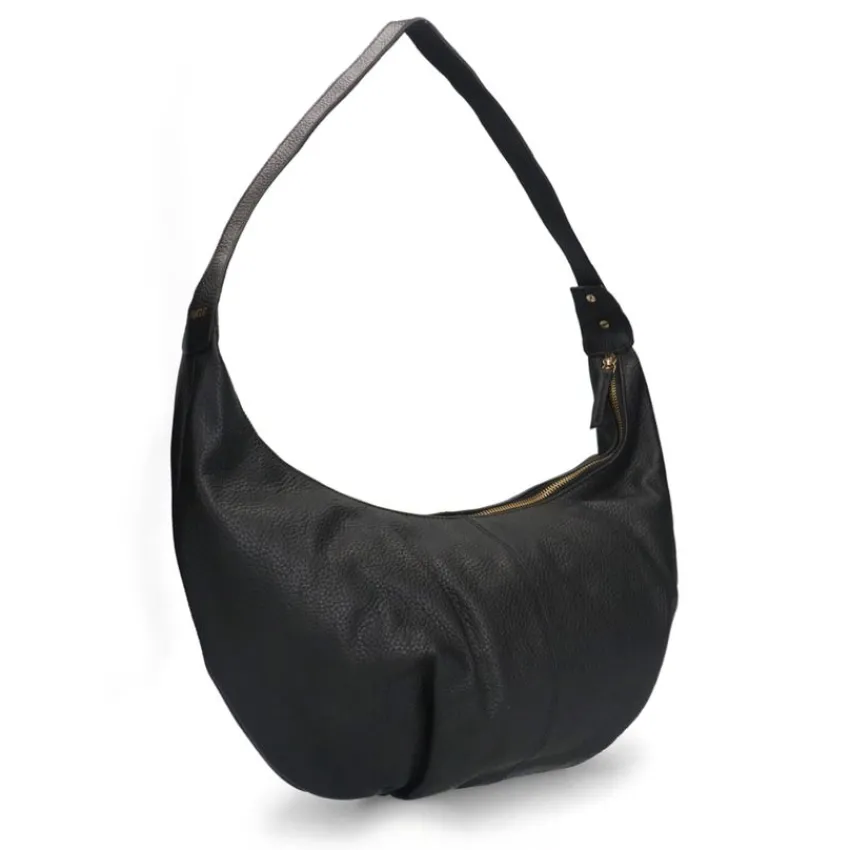 Zwarte leren schoudertas van Manfield met verstelbare schouderband. De afmeting van deze tas is 46x21x13 cm (BxHxD), voorzien van een ritssluiting.