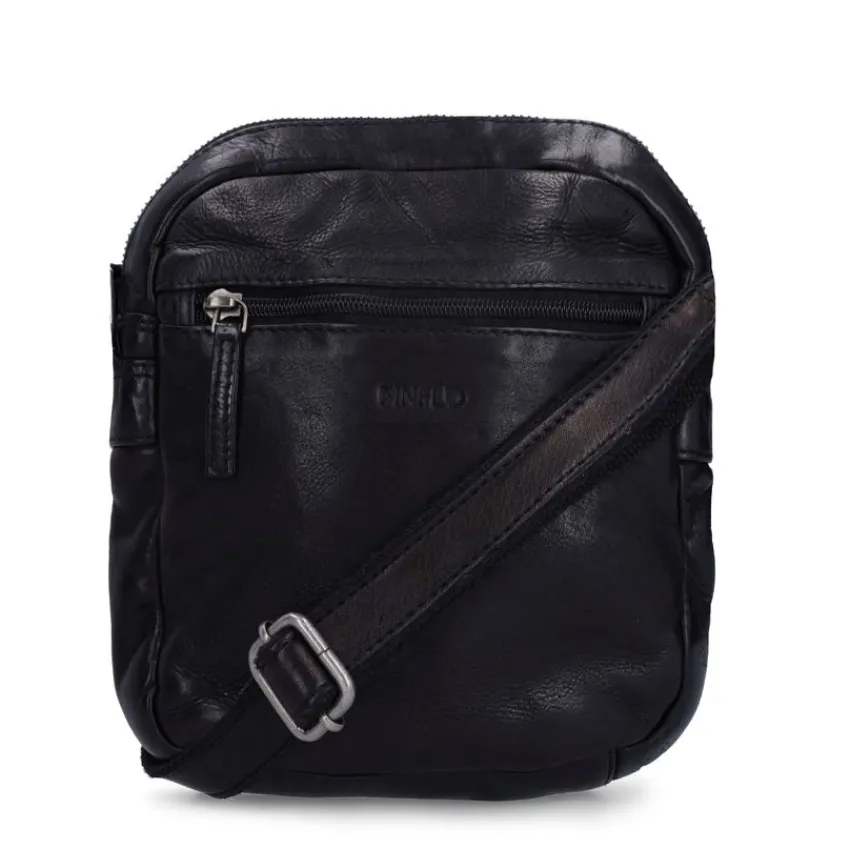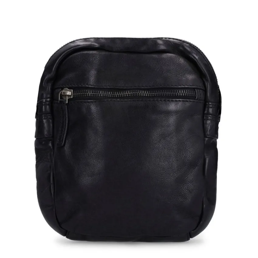 Zwarte leren schoudertas van Manfield met verstelbare band van 115 cm en ritssluiting. De tas heeft een afmeting van 24x21x7 cm, (LxBxH).