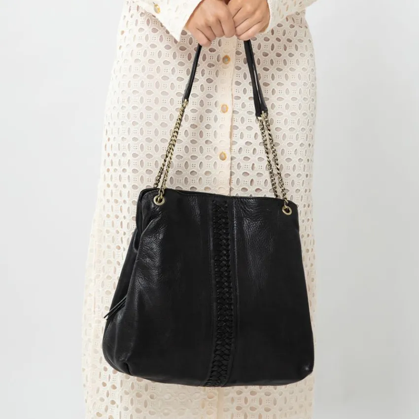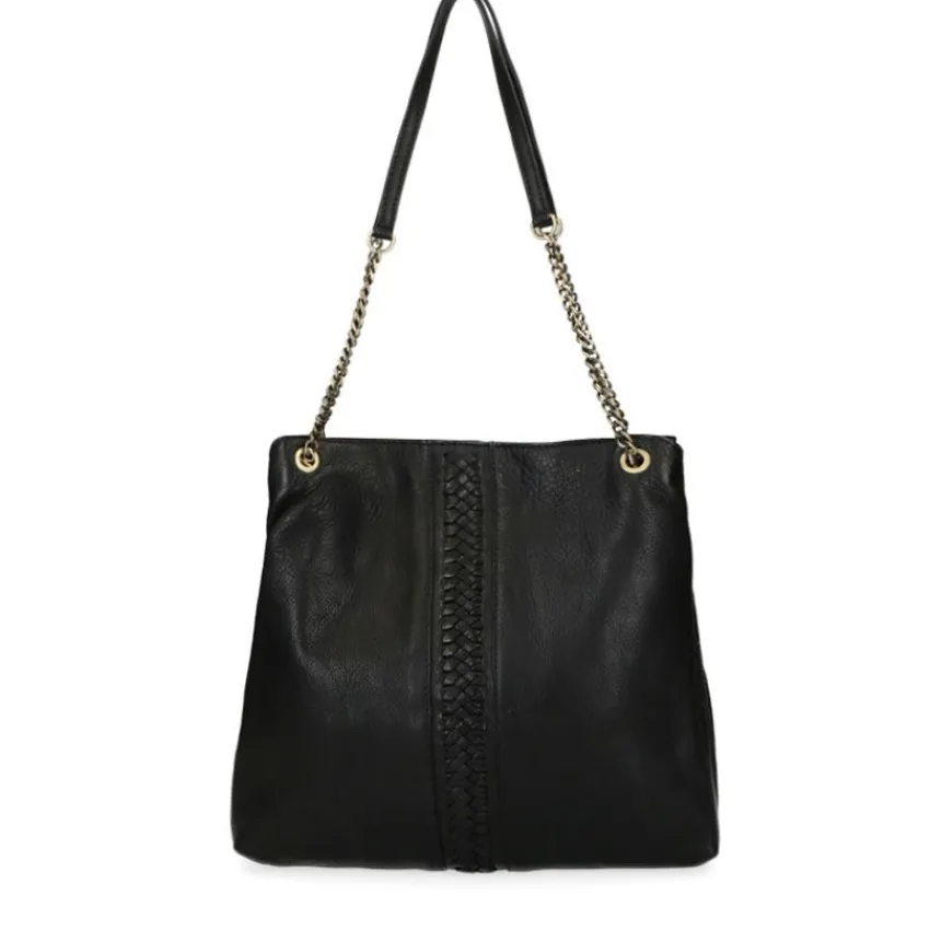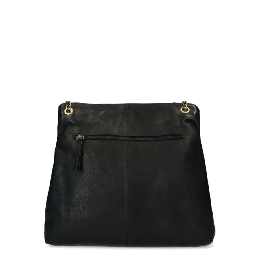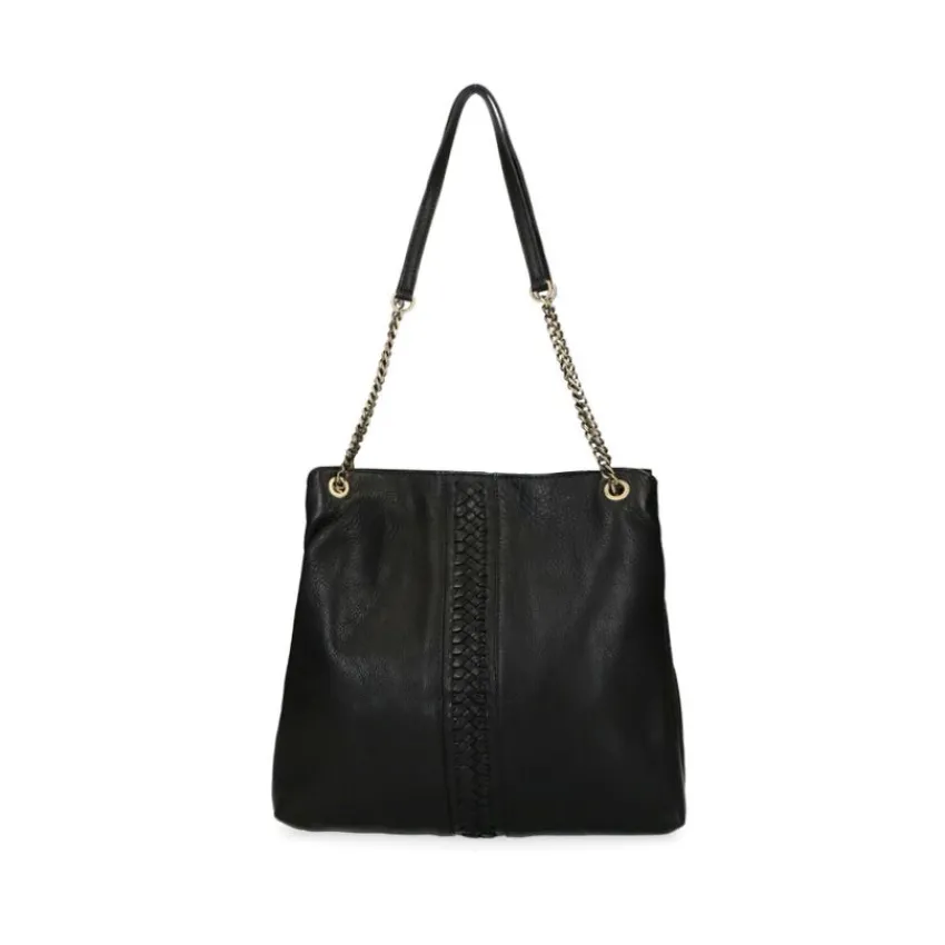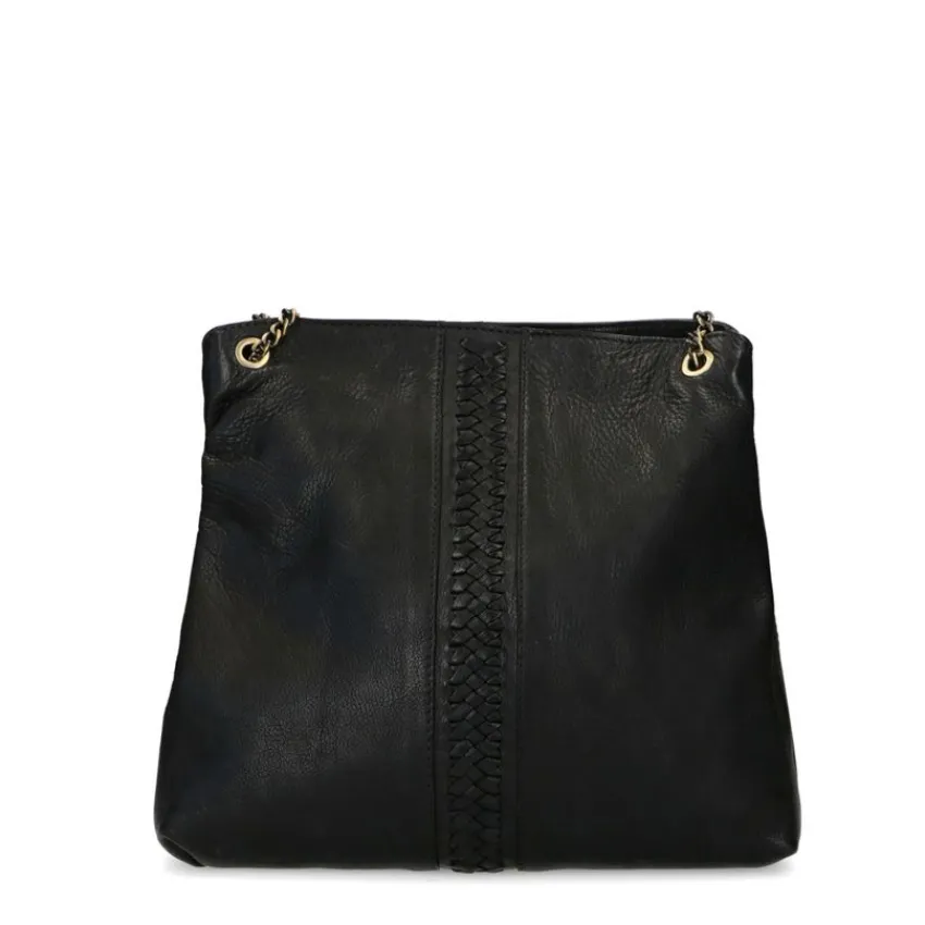 Zwarte, leren schoudertas van Manfield. Een leuke twist op de klassieke schoudertas door het gevlochten detail aan de voorkant. De tas heeft twee schouderhengsels die bestaan uit een ketting en een leren stuk bovenaan. De afmetingen van de tas: 30x33x12 (lxbxd). De tas bestaat uit drie vakken. Het binneste vak is afsluitbaar met een rits, de buitenste twee vakken gaan dicht met een drukknoop. De tas bestaat aan de buitenkant uit leer en de binnenkant is een combinatie van leer en textiel.