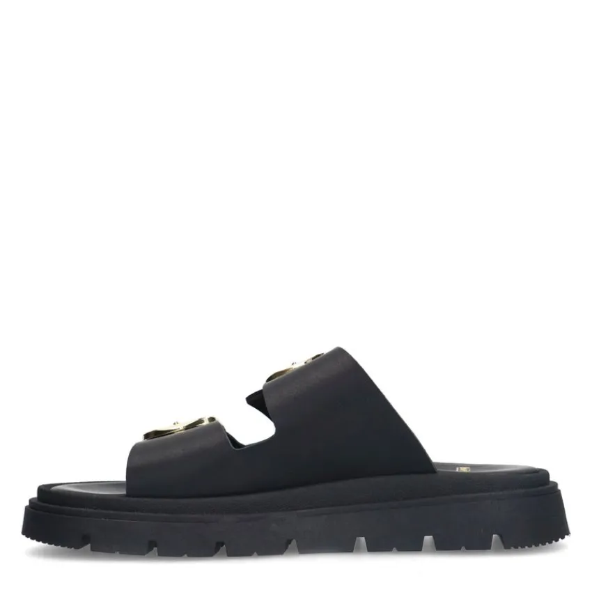 Zwarte leren slippers met gesp van Manfield. De slippers hebben een rubberen zool van 4 cm en twee brede banden met een gesp die over de voorvoet lopen. We adviseren als verzorging en bescherming de Collonil Carbon Pro.