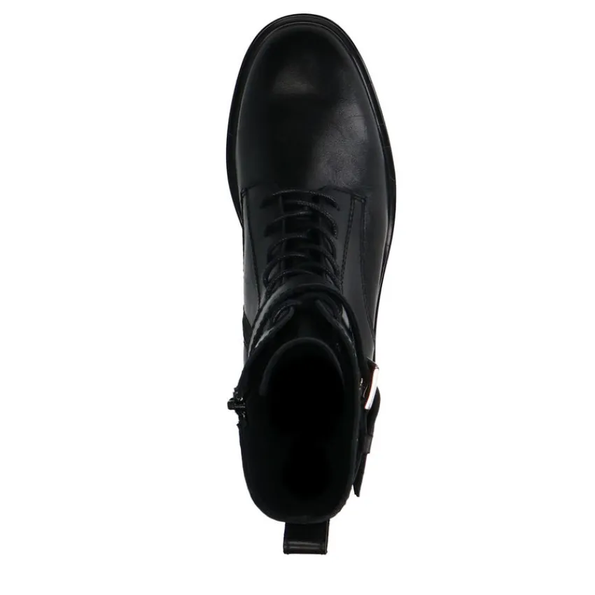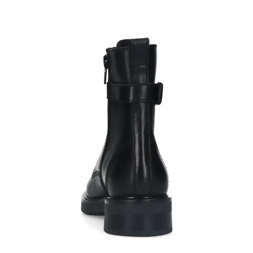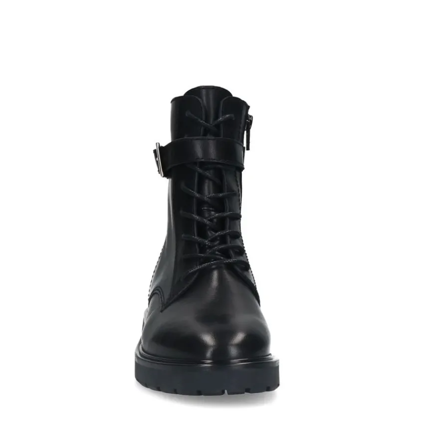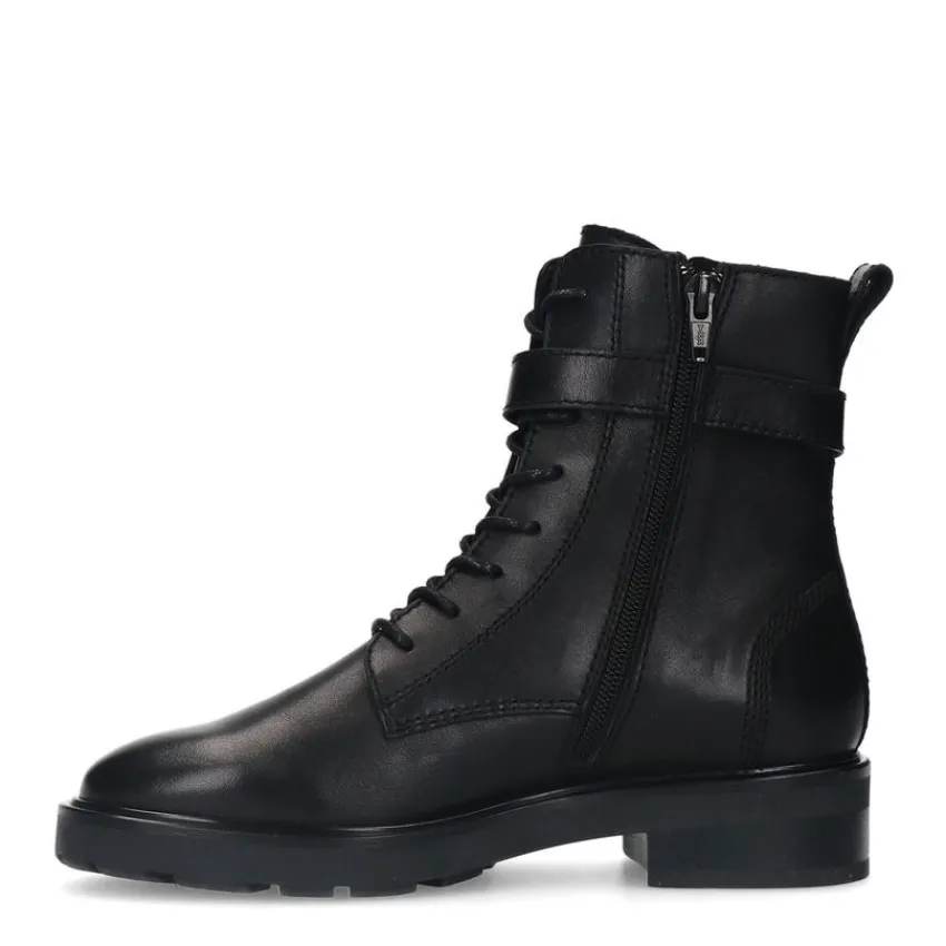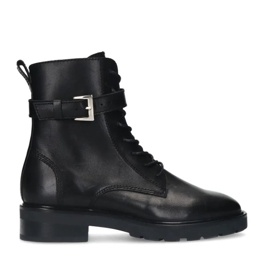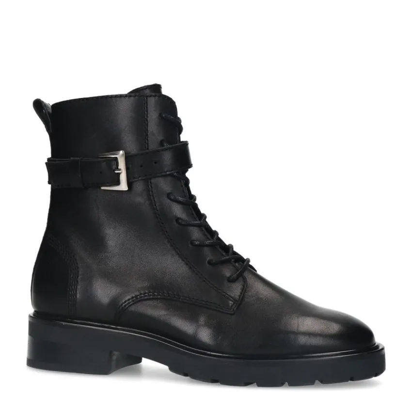 Zwarte leren veterlaarsjes van Manfield. Deze veterlaarsjes zijn gemaakt van leer en daarom raden we je aan deze laarsjes voor dames te verzorgen en beschermen met de Collonil Carbon Pro. Deze veterlaarzen zorgen voor een optimaal loopcomfort en kunnen gesloten worden door middel van de ritssluiting aan de binnenzijde en de vetersluiting over de upper. De zilverkleurige gesp rondom de enkel zorgt voor nét dat beetje extra. De platte hak heeft een hoogte van 2 cm en de schacht heeft een hoogte van 17 cm. De schachtomtrek bedraagt 28 cm.