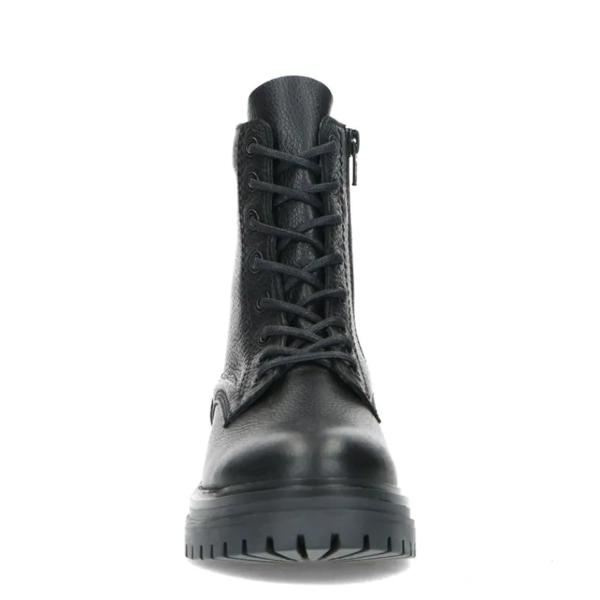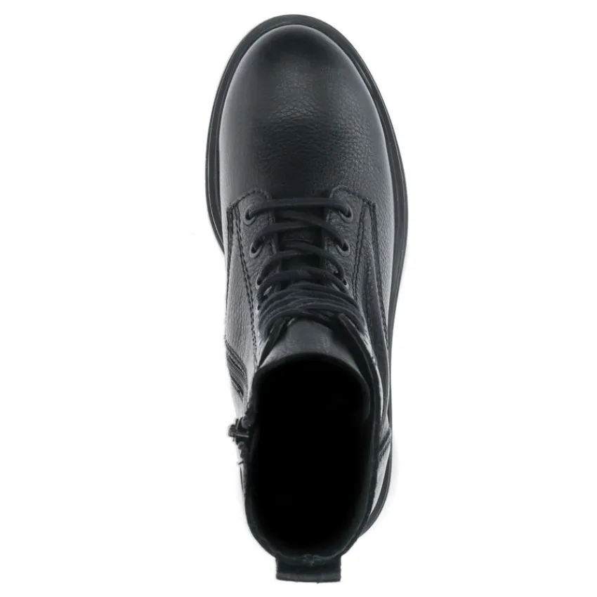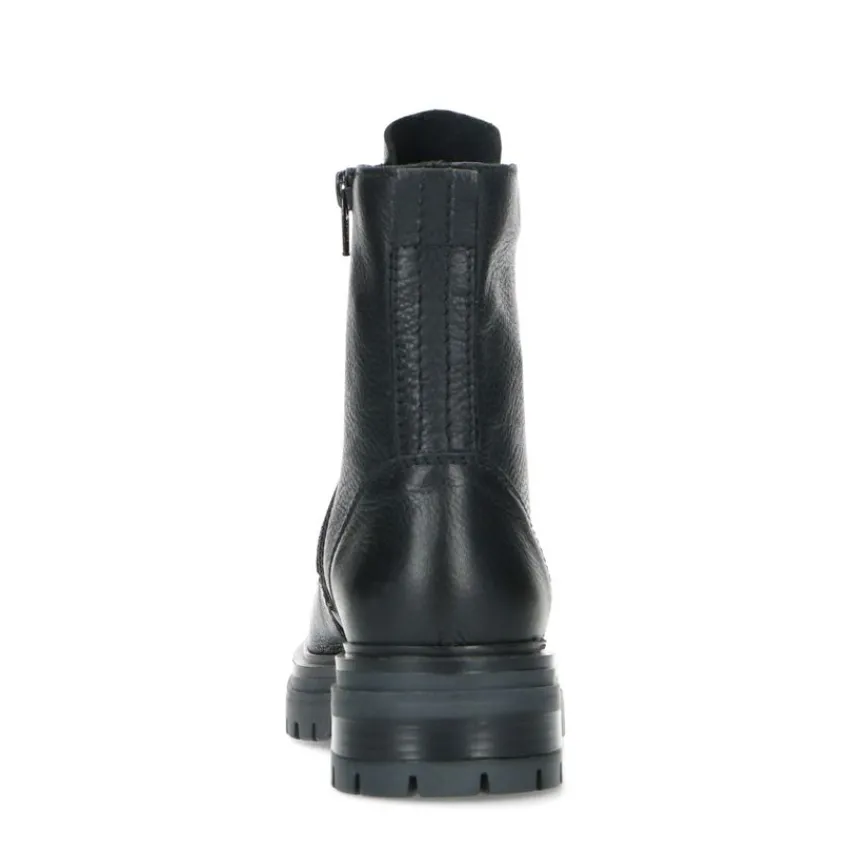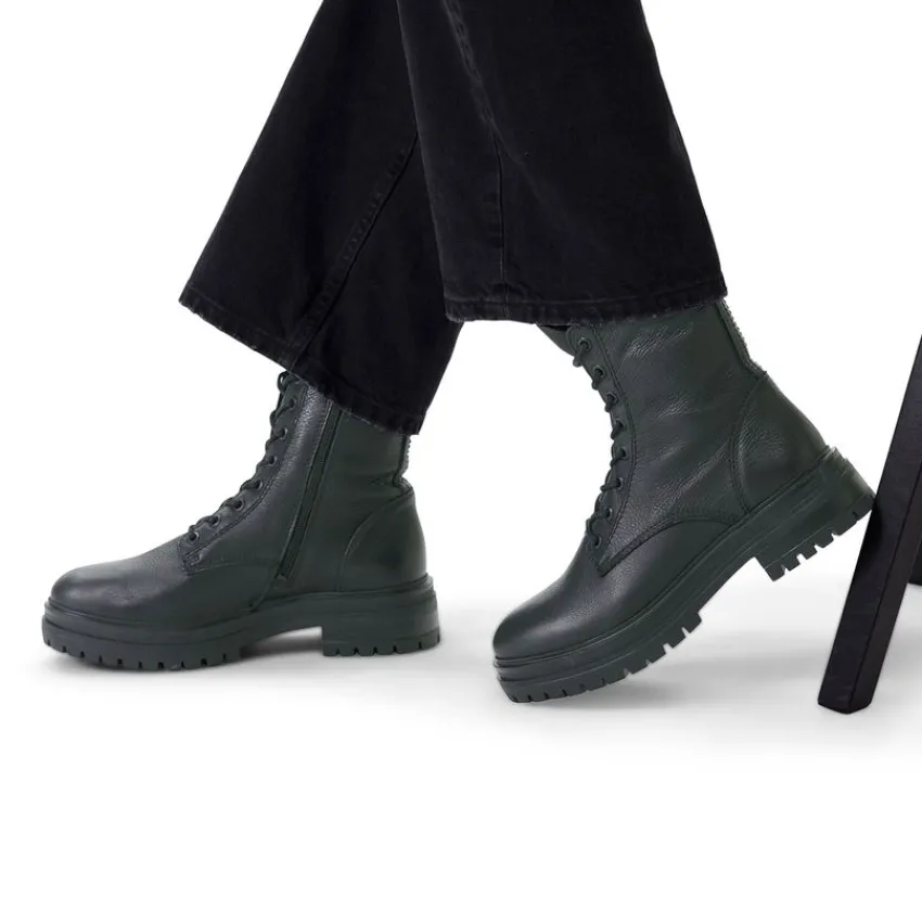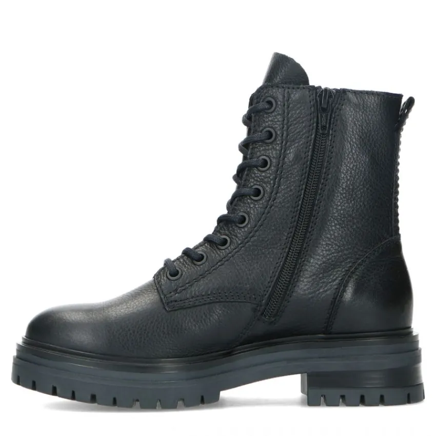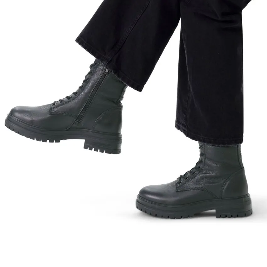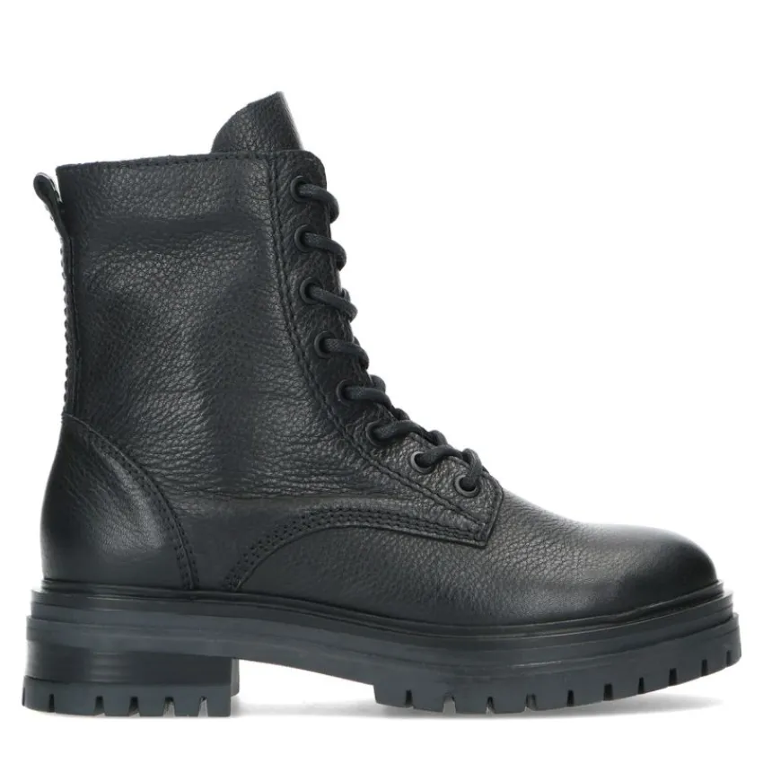 Zwarte veterlaarsjes van Manfield. De buitenkant en binnenkant zijn beide volledig gemaakt van leer, waardoor de veterlaarsjes een stoere uitstraling krijgen. Aan de binnenzijde zit een rits en je kunt ze strakker aantrekken middels de veters. De plateauzool heeft een hoogte van 5 cm en is grof afgewerkt. Draag ze onder een jurkje en maak gebruik van de juiste onderhoudsproducten.
