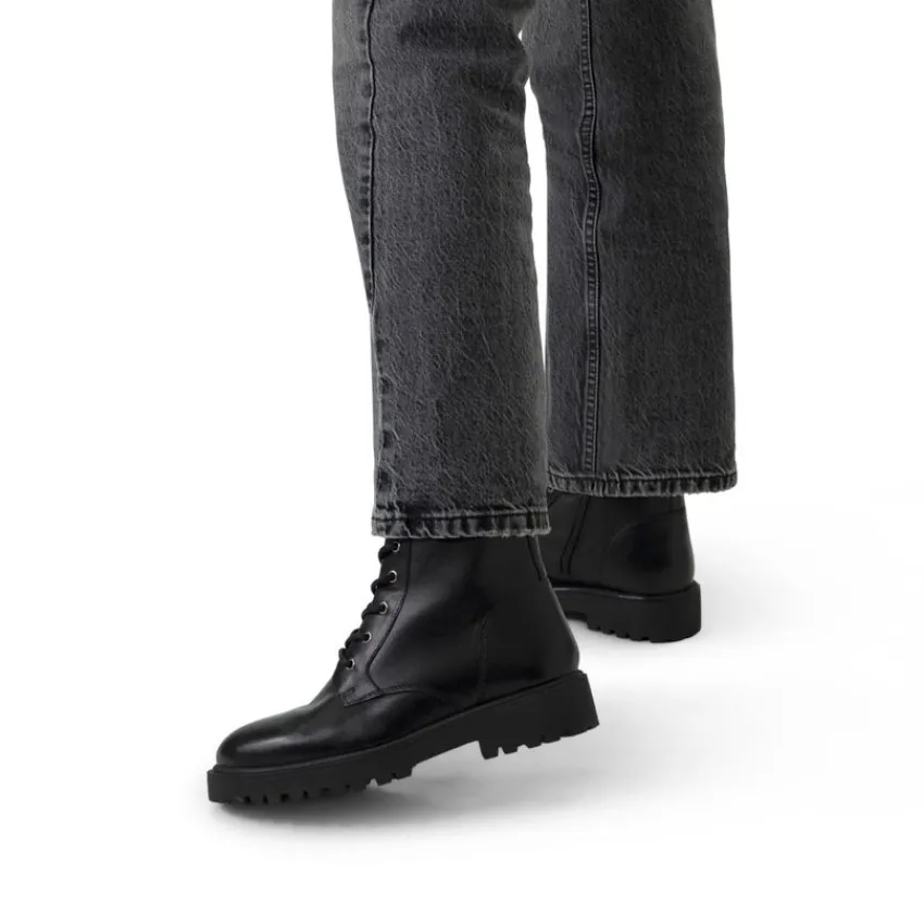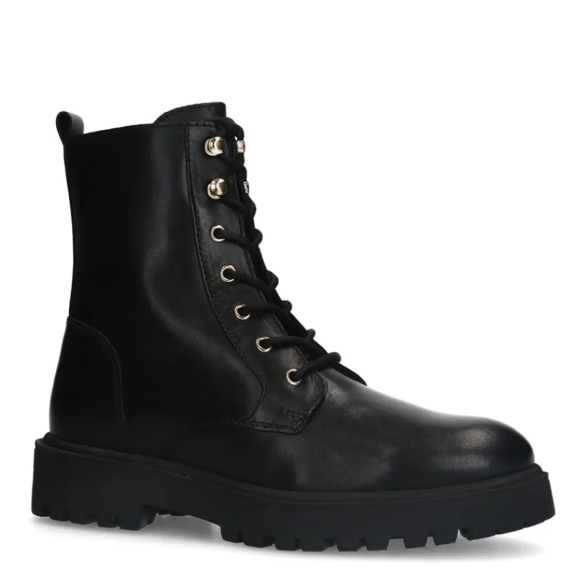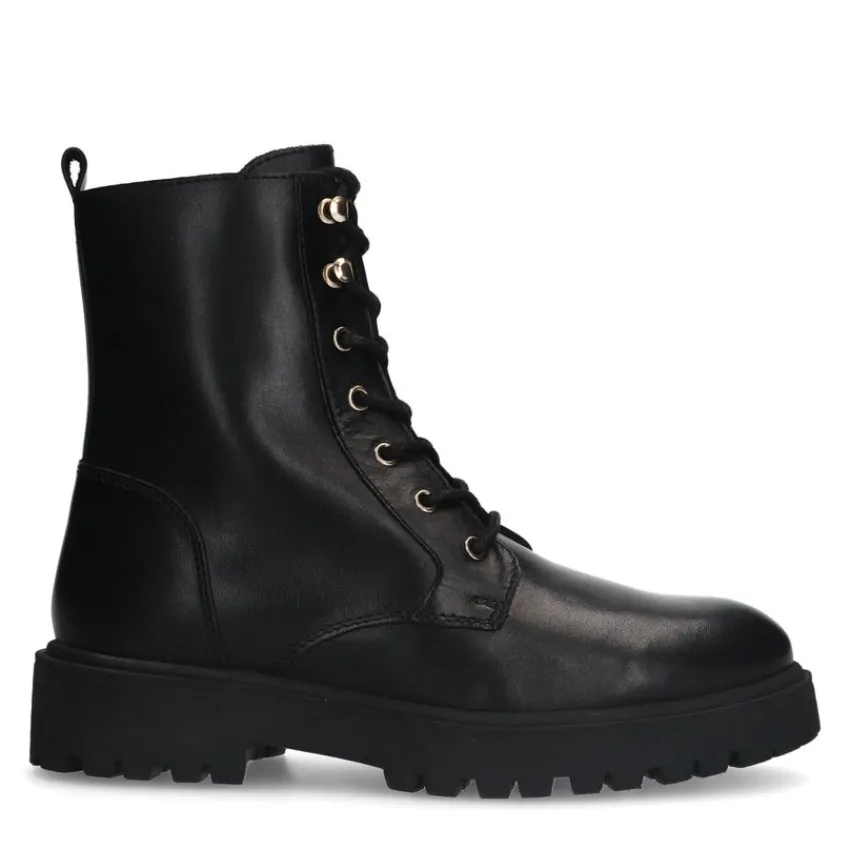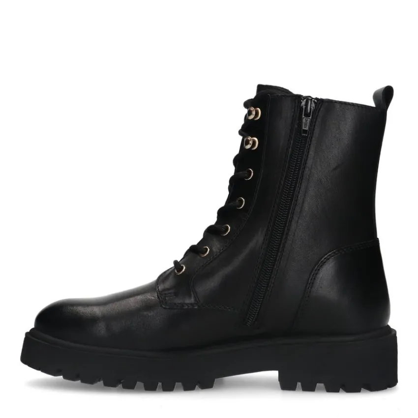 Zwarte leren veterlaarsjes van Manfield. met een platte hak van 3 cm, goudkleurige veterogen en ritssluiting aan de binnenzijde. De laarsjes hebben een schachthoogte van 15 cm en de schachtomtrek bedraagt 27 cm. We adviseren als verzorging en bescherming de Collonil Carbon Pro.