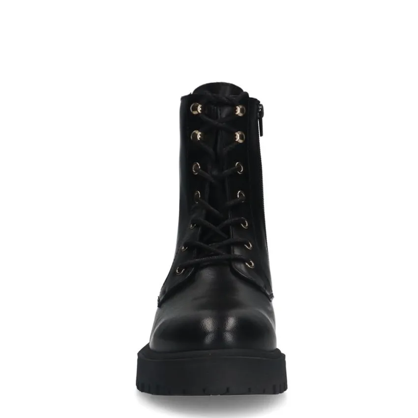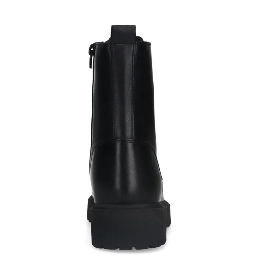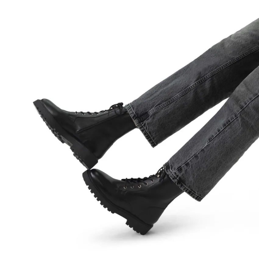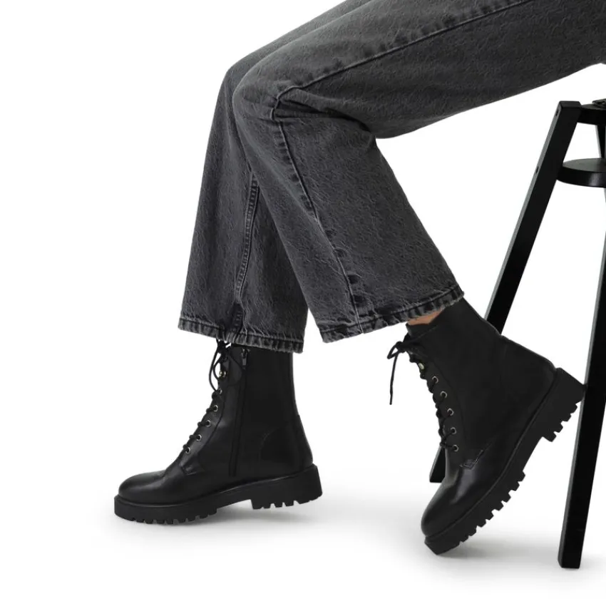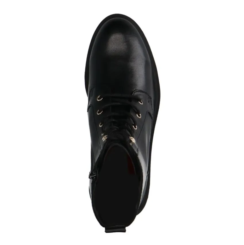 Zwarte leren veterlaarsjes van Manfield. met een platte hak van 3 cm, goudkleurige veterogen en ritssluiting aan de binnenzijde. De laarsjes hebben een schachthoogte van 15 cm en de schachtomtrek bedraagt 27 cm. We adviseren als verzorging en bescherming de Collonil Carbon Pro.
