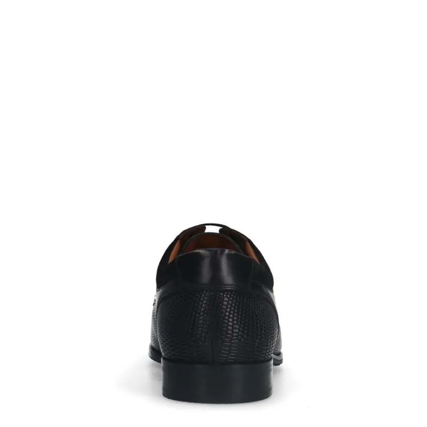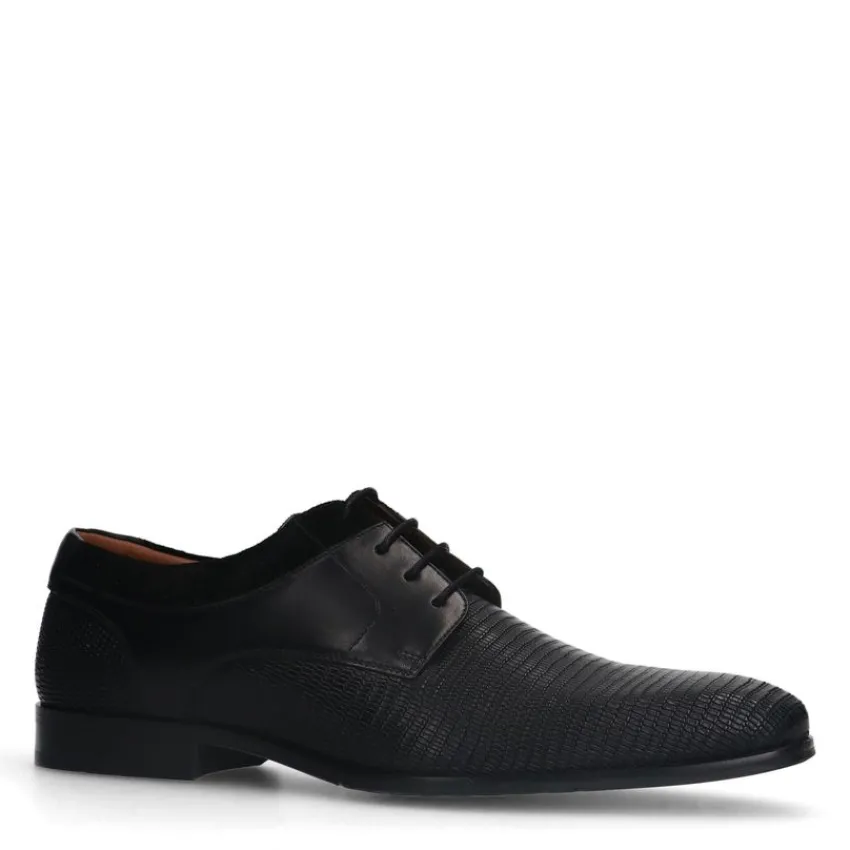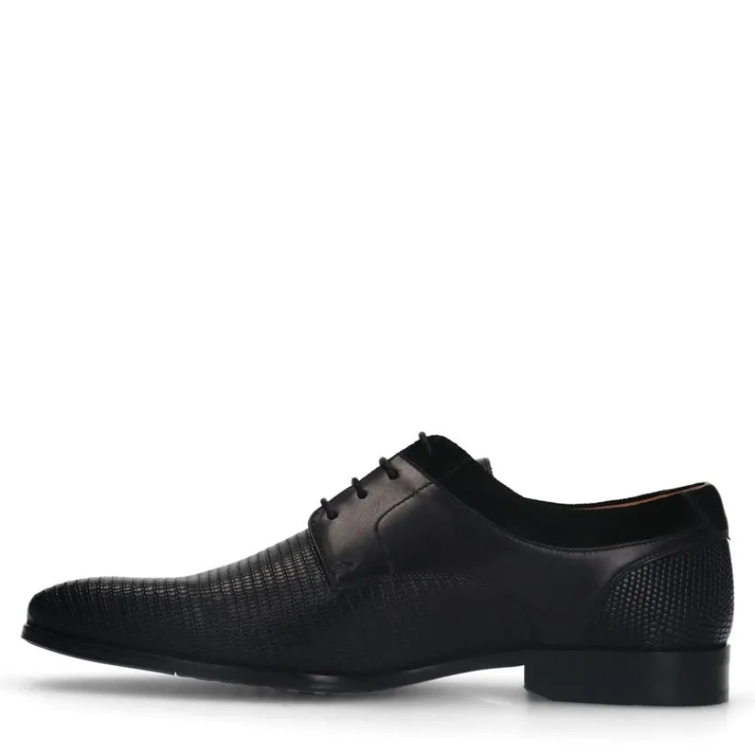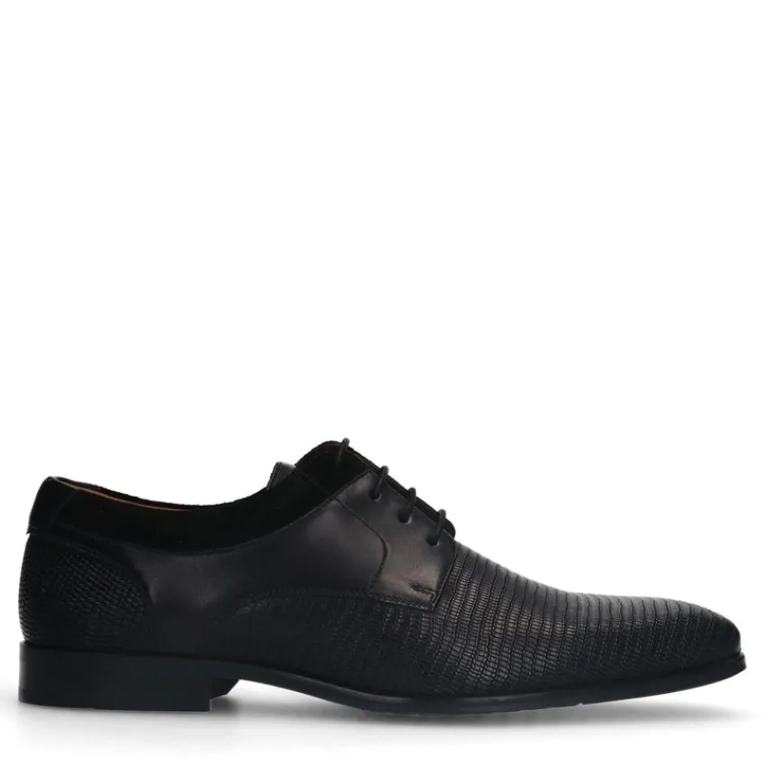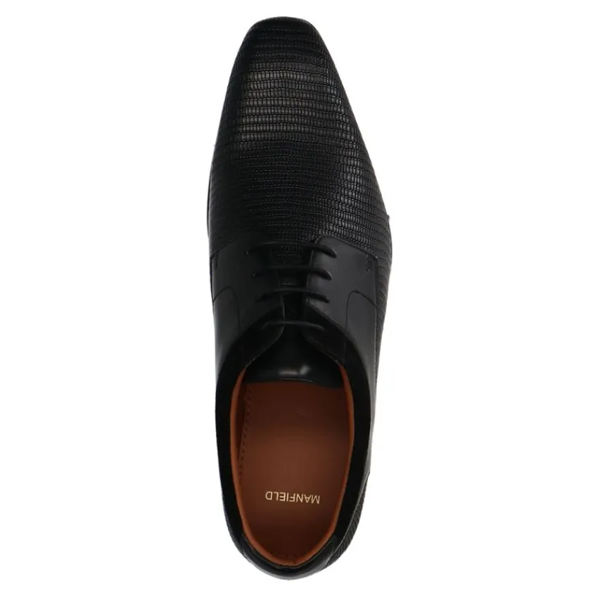 Zwarte leren veterschoenen met zacht detail van Manfield. Deze derby veterschoenen hebben een platte hak van 2 cm. We adviseren als verzorging en bescherming de Collonil Carbon Pro.