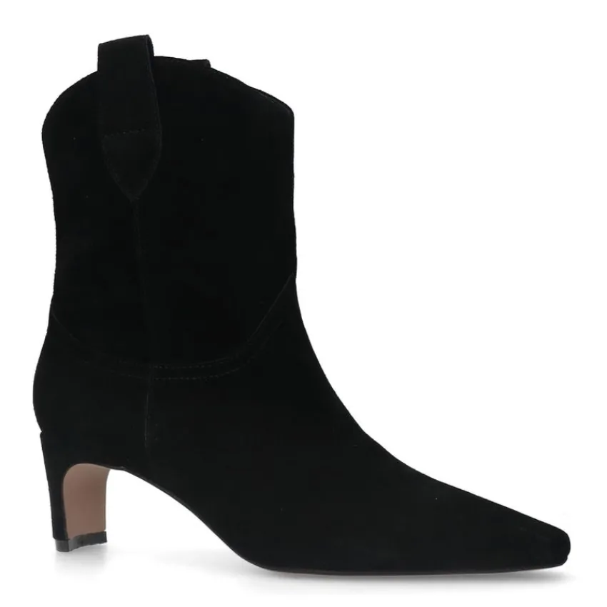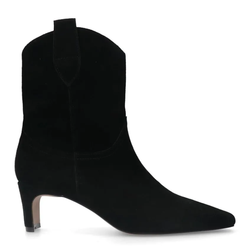 Zwarte suède enkellaarsjes met hak van Manfield. De laarsjes hebben een vierkante neus en een hak van 5 cm. We adviseren als verzorging en bescherming de suède/nubuck spray in transparant.