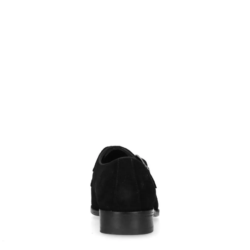 Zwarte suède loafers van het merk Manfield. Deze herenschoen met één gesp zijn suède aan de buitenzijde en van leer aan de binnenzijde. Ze hebben een hakhoogte van 3 cm. Door de rustige uitstraling gaan de schoenen hand-in-hand met zowel een zakelijke als casual look. Draag ze onder een leuke chino of een pantalon met blouse.