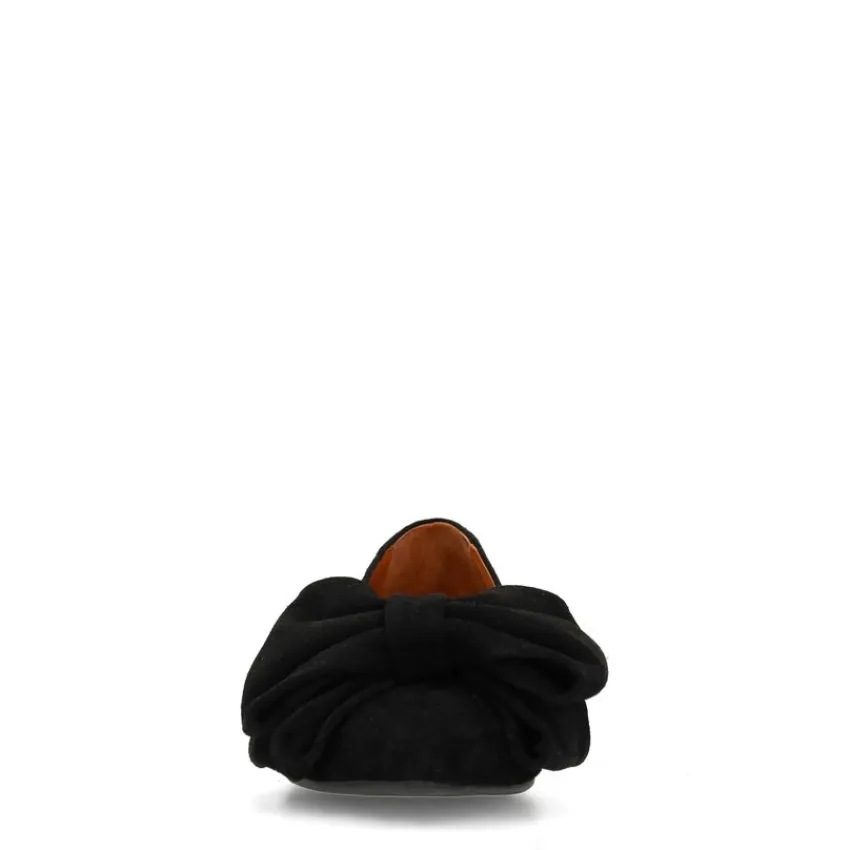 Zwarte suède loafers van Manfield met een strik op de voorvoet en platte hak van 1 cm. We adviseren als verzorging en bescherming de Suède/nubuck spray in transparant.