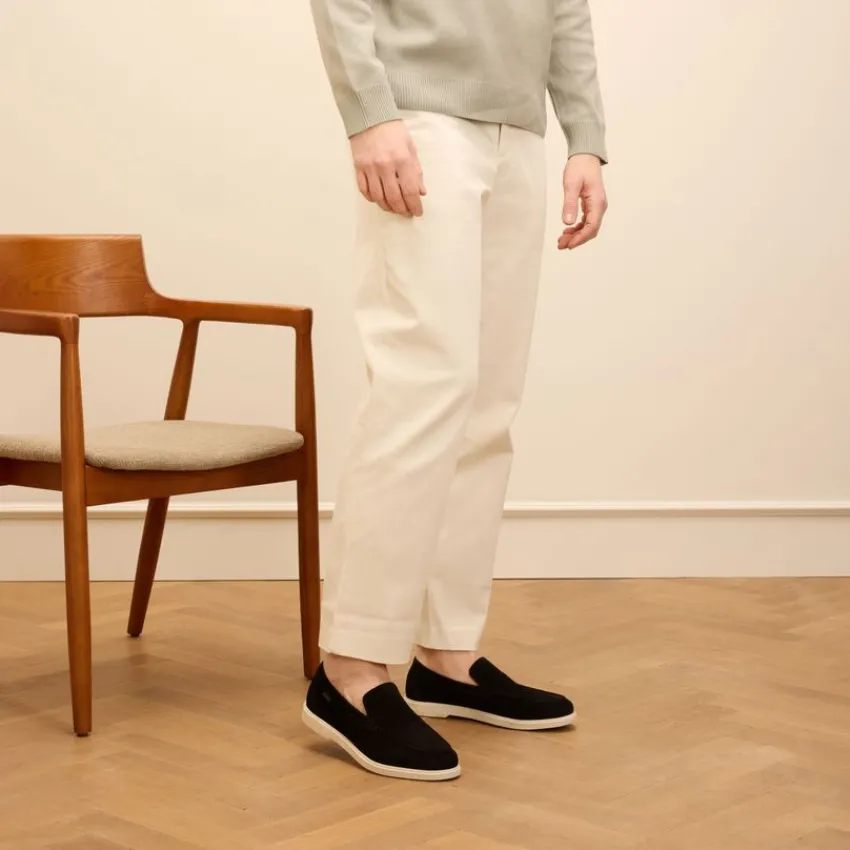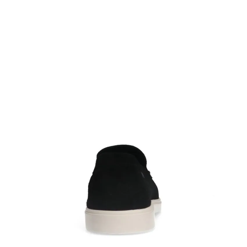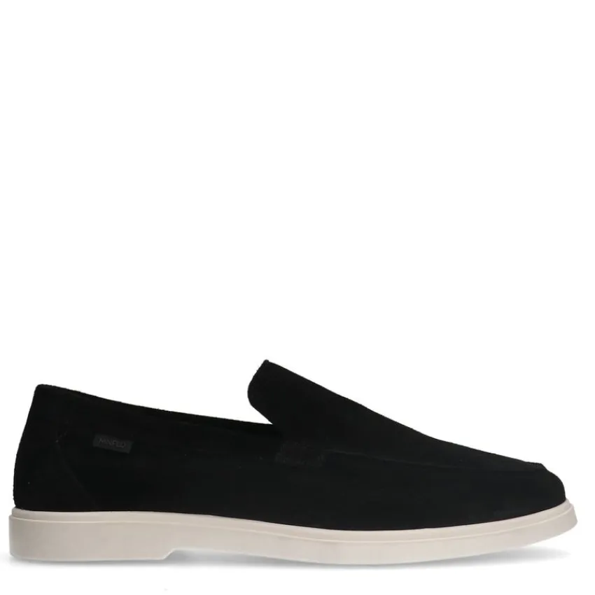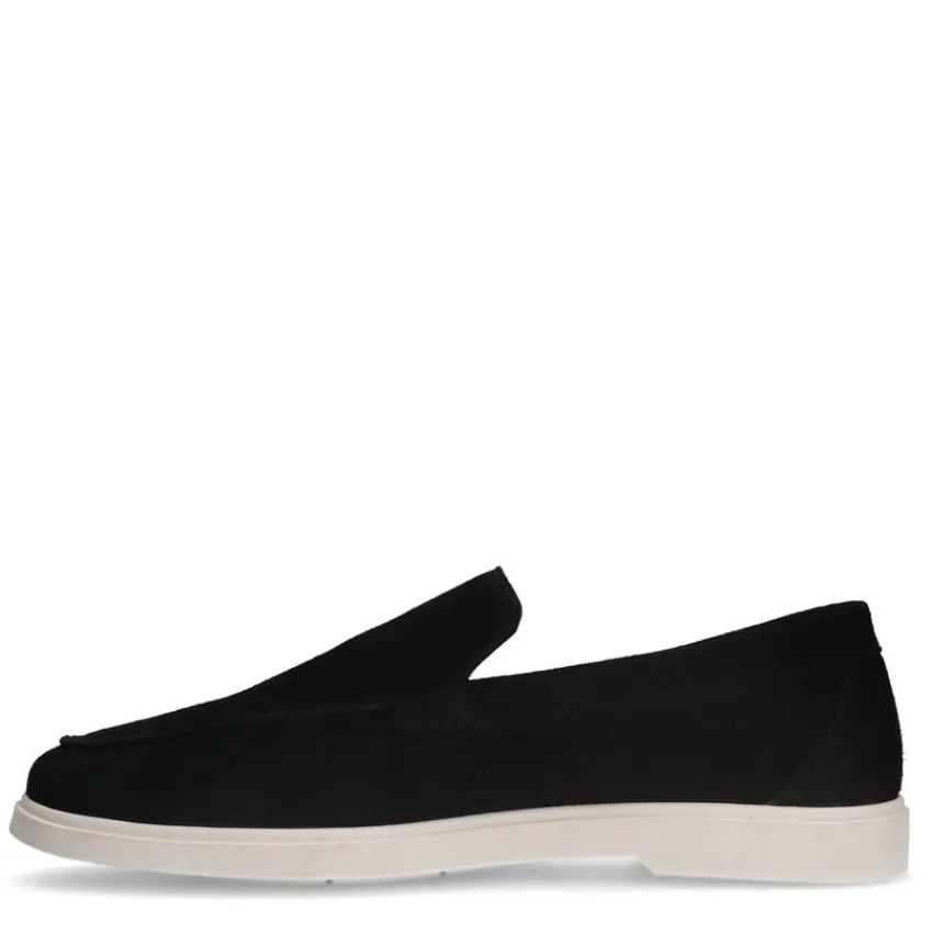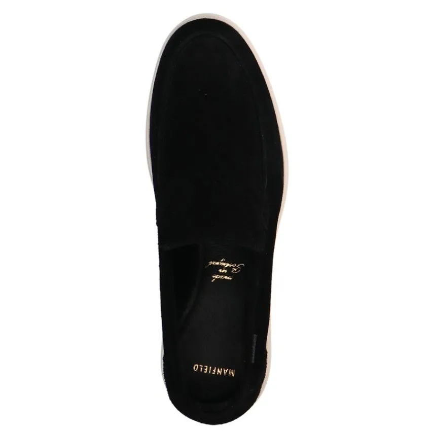 Zwarte suède loafers van Manfield met een platte hak van 2 cm. We adviseren als verzorging en bescherming de suède/nubuck spray in transparant.