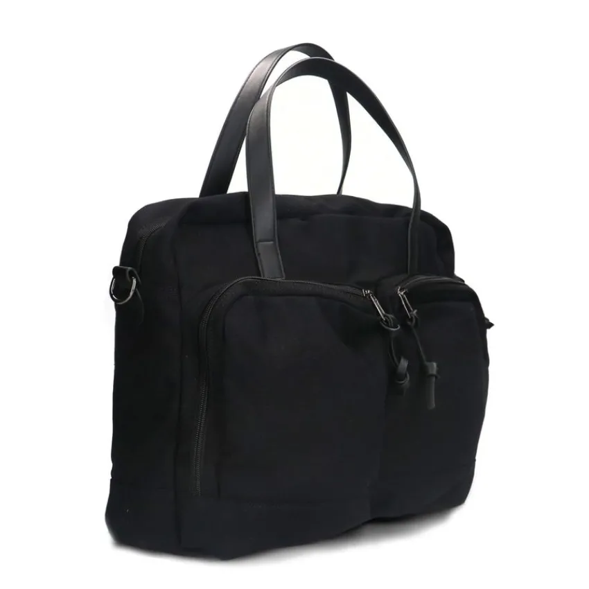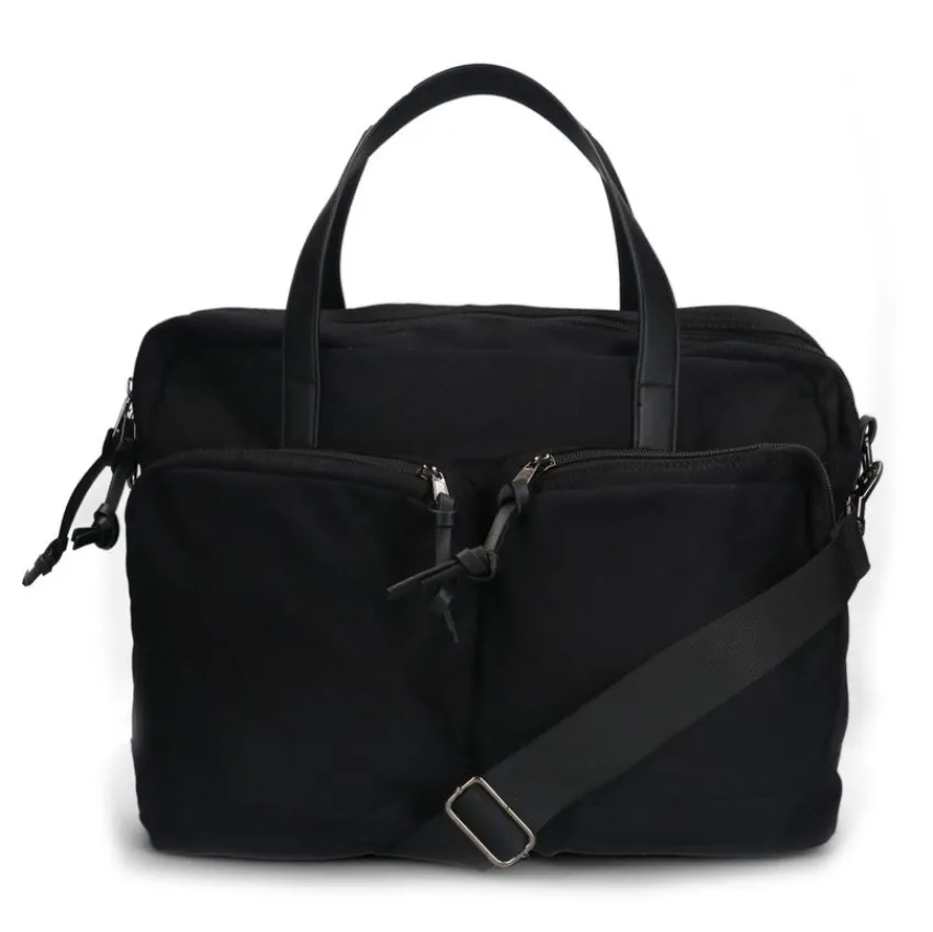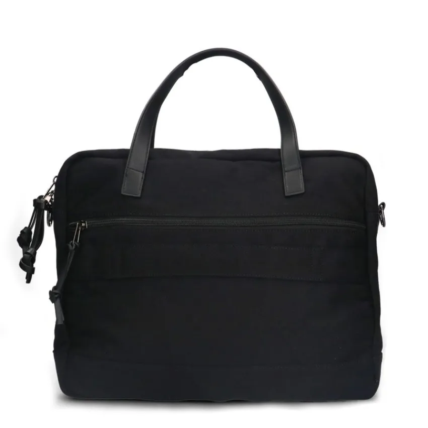 Zwarte textiele laptoptas 17.5 inch van Manfield met grote ritssluiting en 2 kleine vakjes met ritssluiting. De afmeting van deze tas is 45x29x16 cm (BxHxD), voorzien van een verstelbare band van 90 cm.