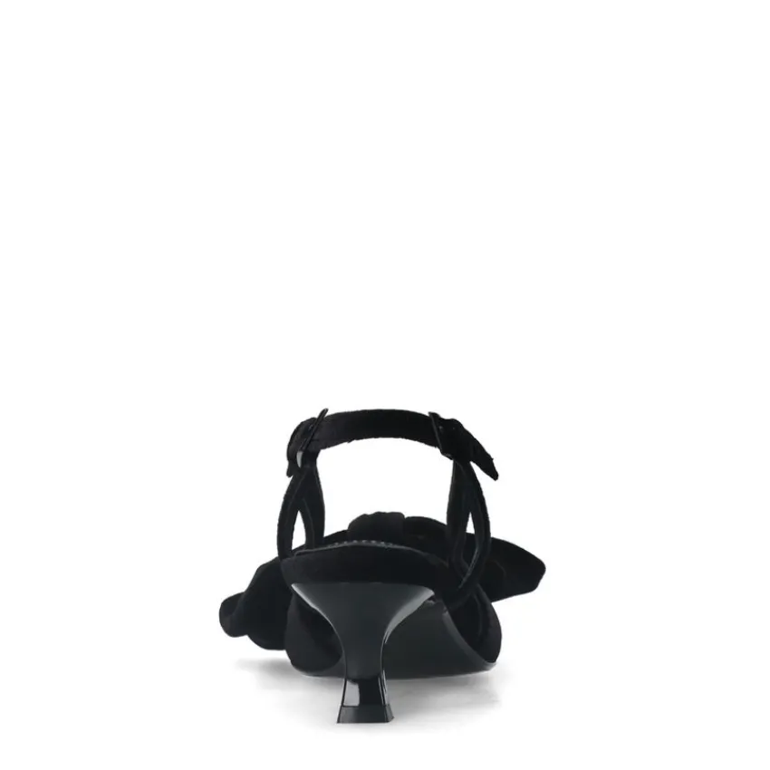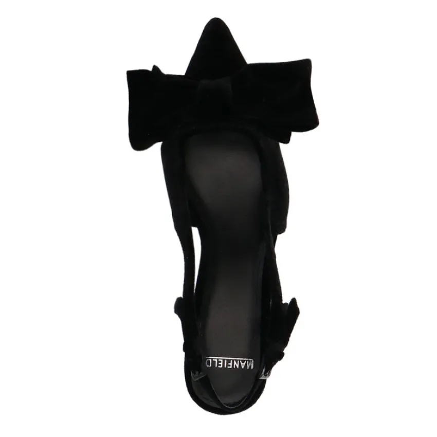 Zwarte velours slingbacks met strik van Manfield. De slingbacks hebben een hak van 5 cm, een gespsluiting rondom de enkels en de binnenkant is gemaakt van leer. We adviseren als verzorging en bescherming de Natural Trendspray.