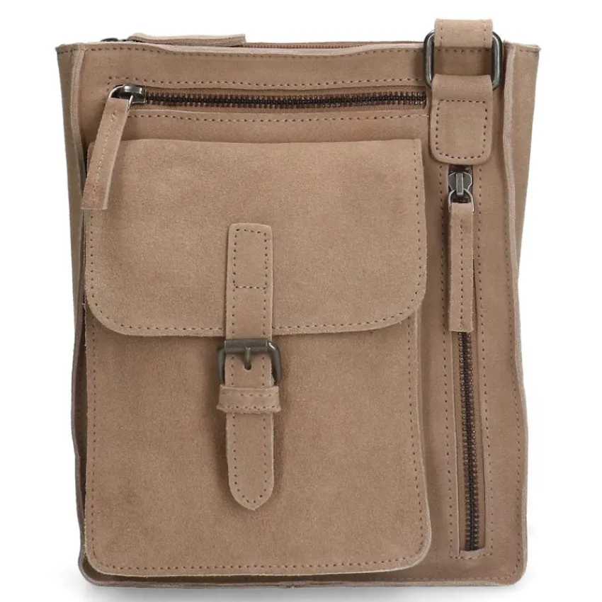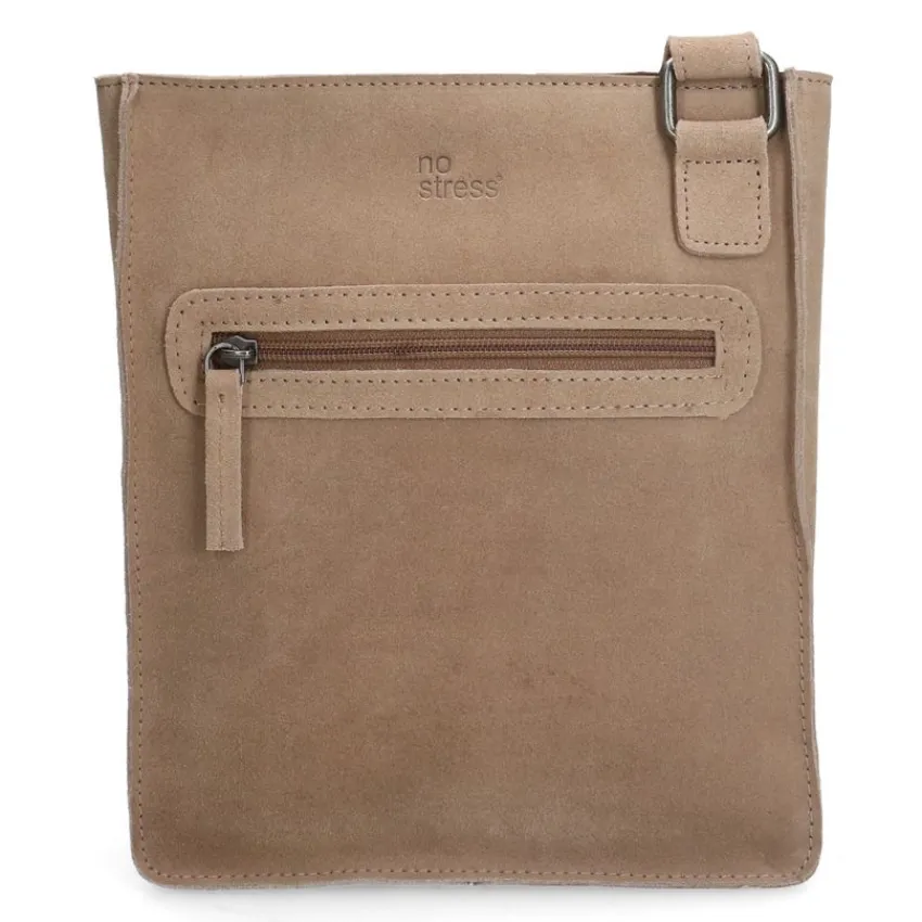 Beige suède schoudertas van het merk No Stress. De afmeting van deze tas is 20x24x5 cm (BxHxD), voorzien van meerdere aparte vakken die sluiten door middel van een ritssluiting. Ook zit er een verstelbare band bij van 135 cm. We adviseren als verzorging en bescherming de suède/nubuck spray in transparant.