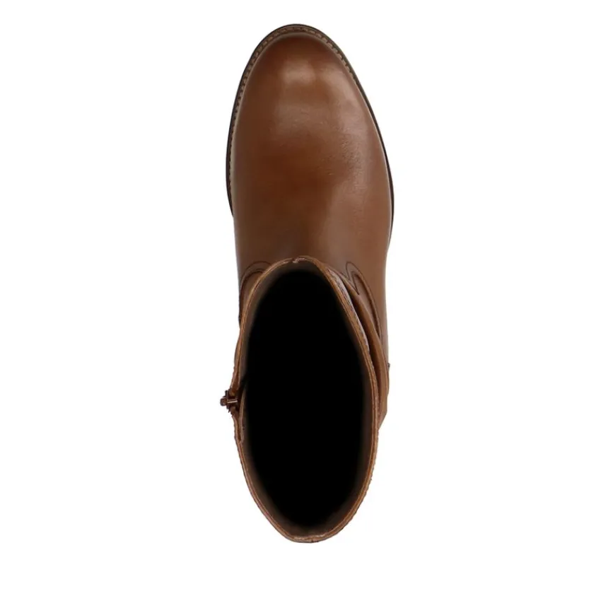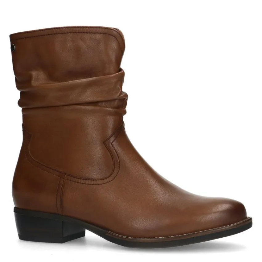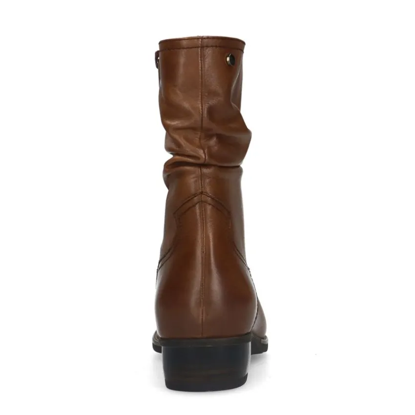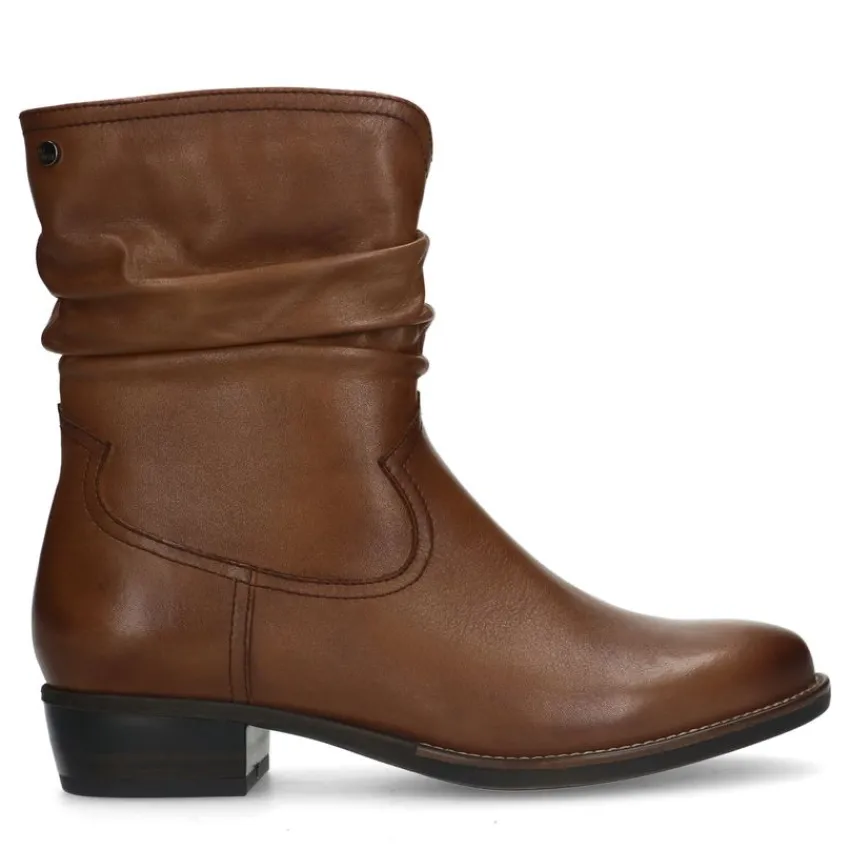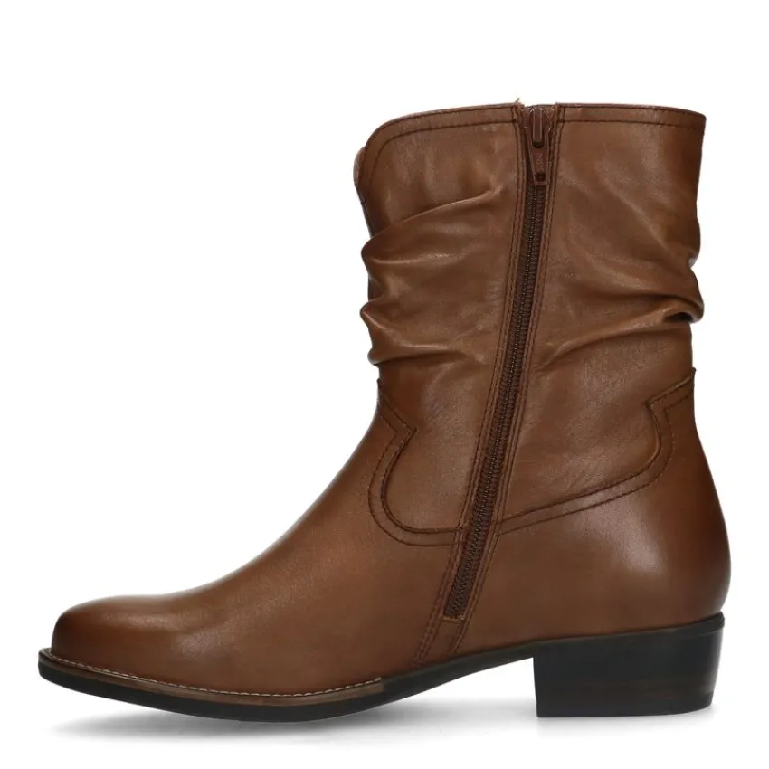Cognac leren enkellaarsjes van het merk No Stress met geribbeld afzak effect en hak van 4 cm. De laarsjes hebben een memory foam voetbed voor optimaal loopcomfort. We adviseren als verzorging en bescherming de Collonil Carbon Pro.