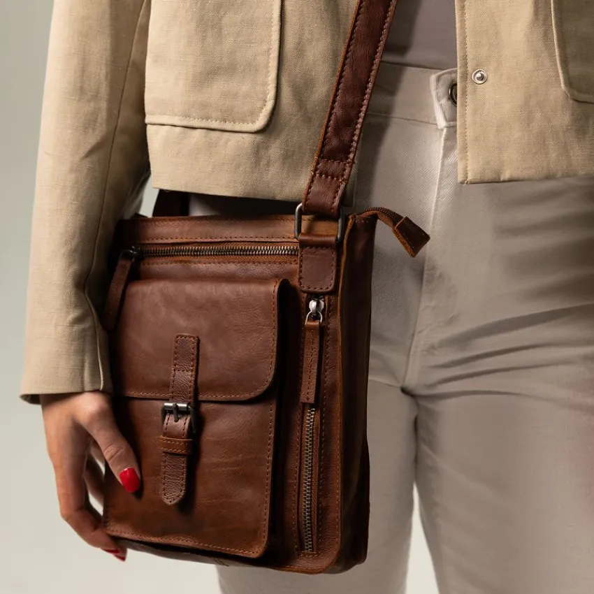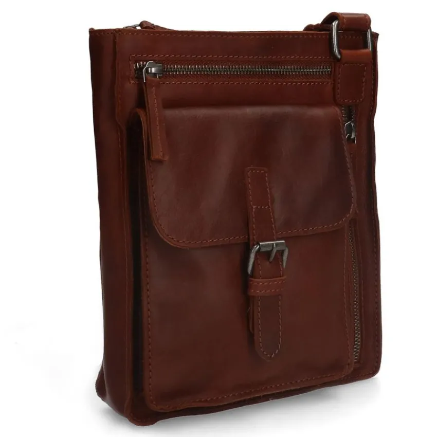 Cognac leren schoudertas van het merk No Stress. De afmeting van deze tas is 20x24x5 cm (BxHxD), voorzien van meerdere aparte vakken die sluiten door middel van een ritssluiting. Ook zit er een verstelbare band bij van 135 cm. We adviseren als verzorging en bescherming de Collonil Carbon Pro.