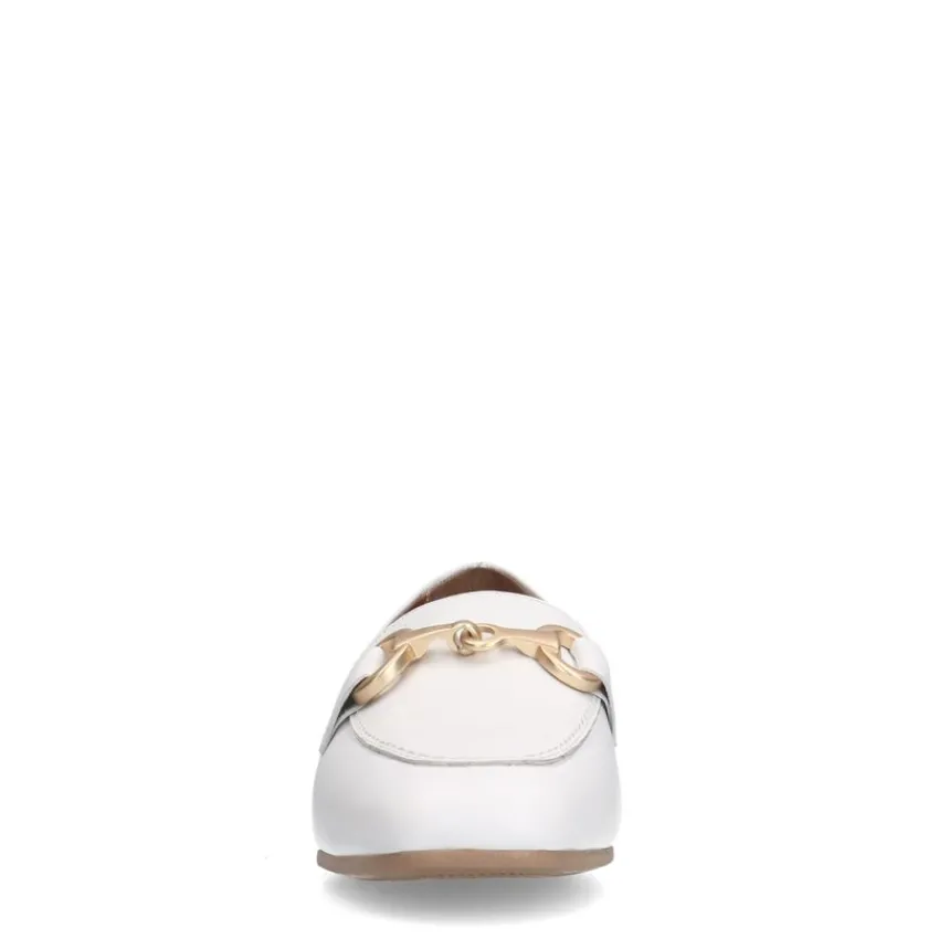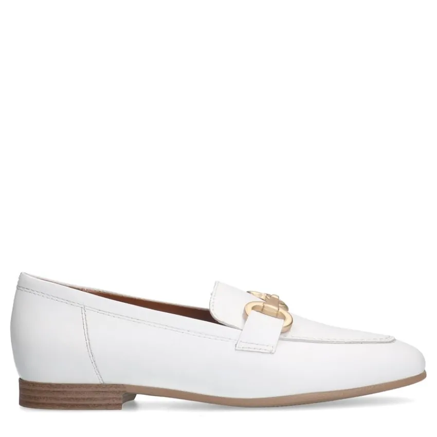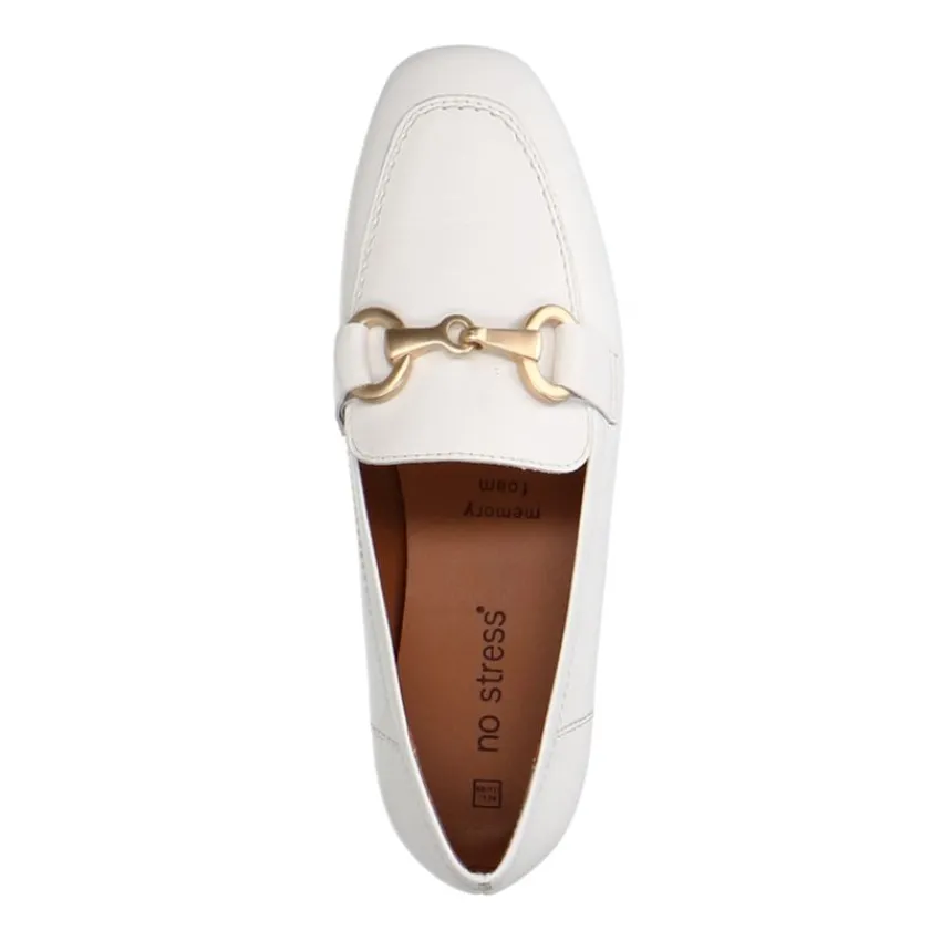 Witte leren loafers van het merk No Stress met goudkleurig detail en platte hak van 1 cm. We adviseren als verzorging en bescherming de Collonil Carbon Pro.