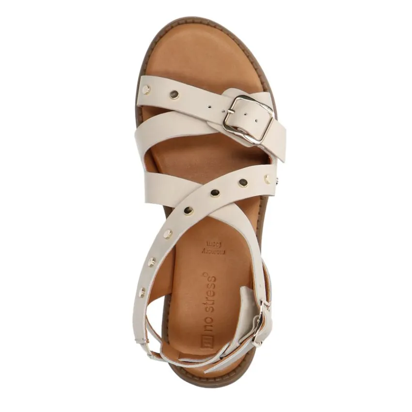 Witte leren sandalen met studs van het merk No Stress. Het voetbed is gemaakt van memory foam en hebben een gespsluiting rondom de enkel. We adviseren als verzorging en bescherming de Collonil Carbon Pro.