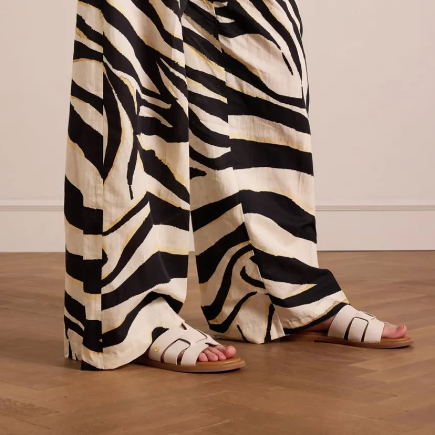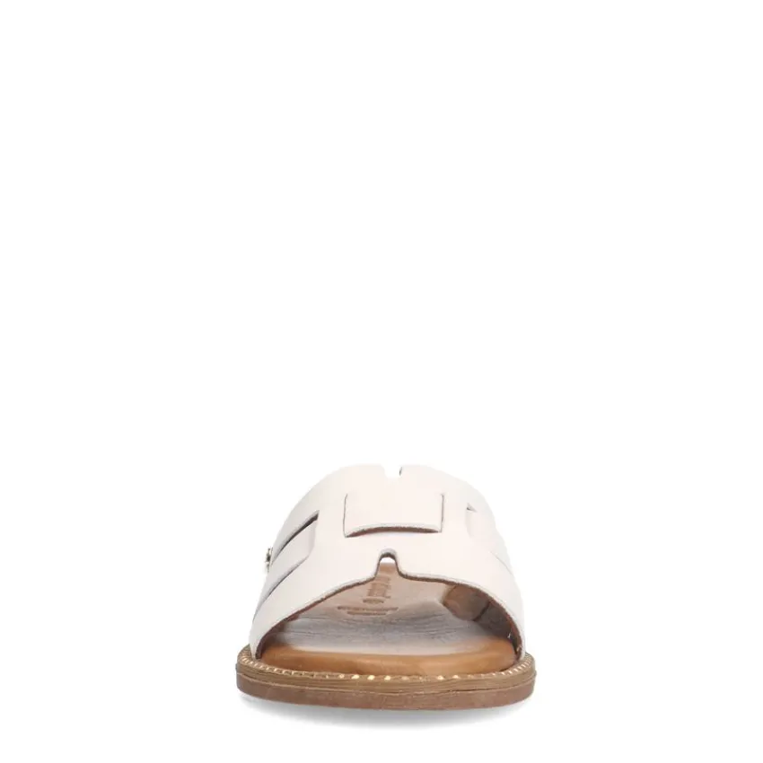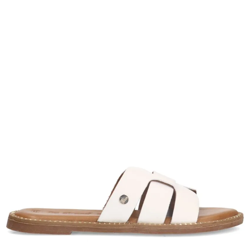 Witte leren slippers van het merk No Stress met een memory foam voetbed en brede band over de voorvoet. We adviseren als verzorging en bescherming de Colonil Carbon Pro.