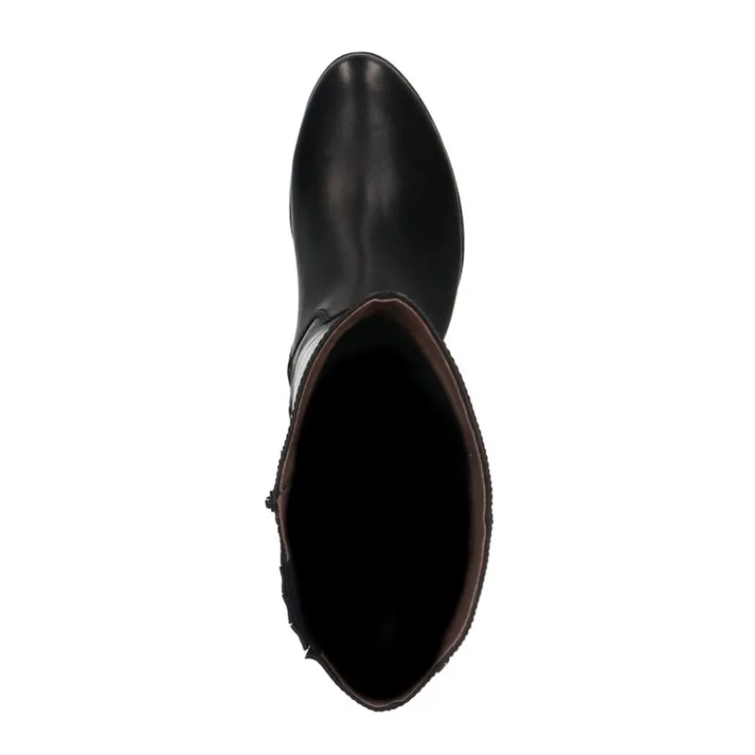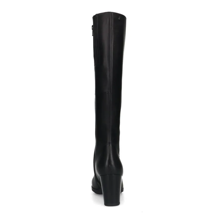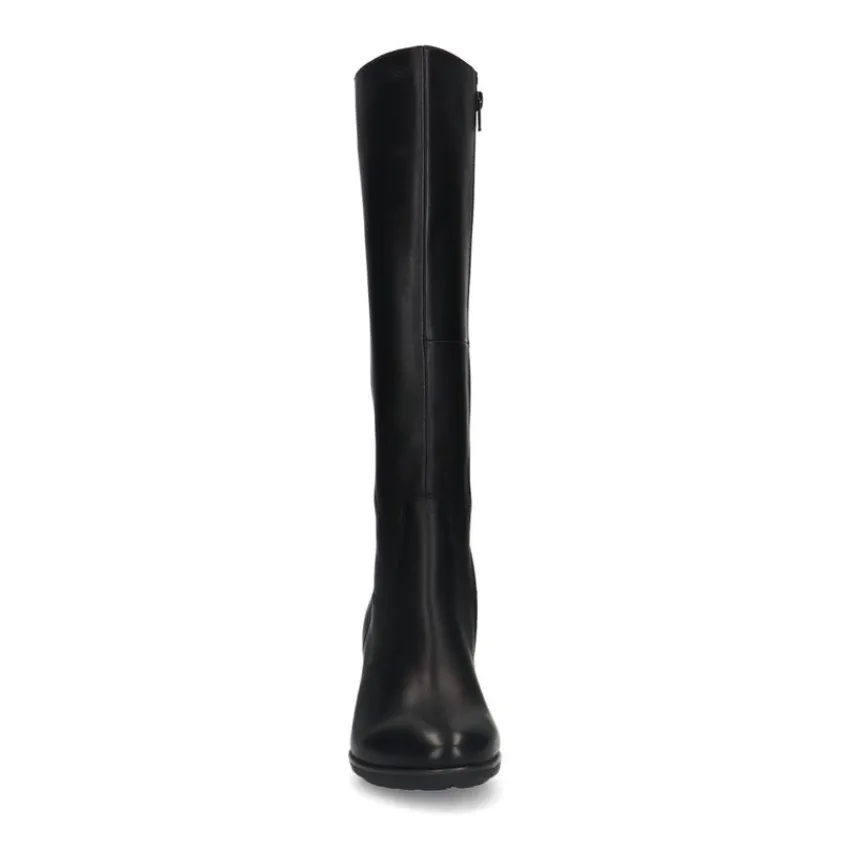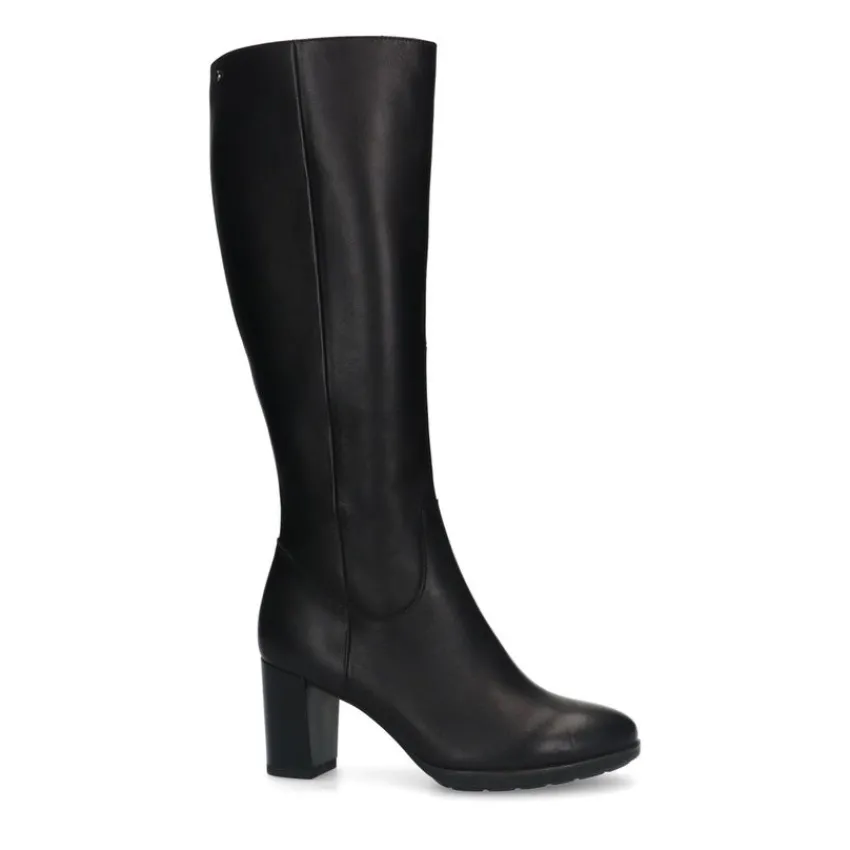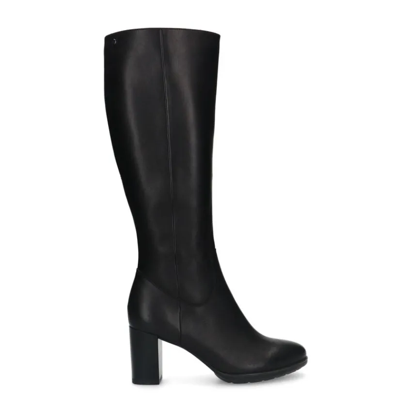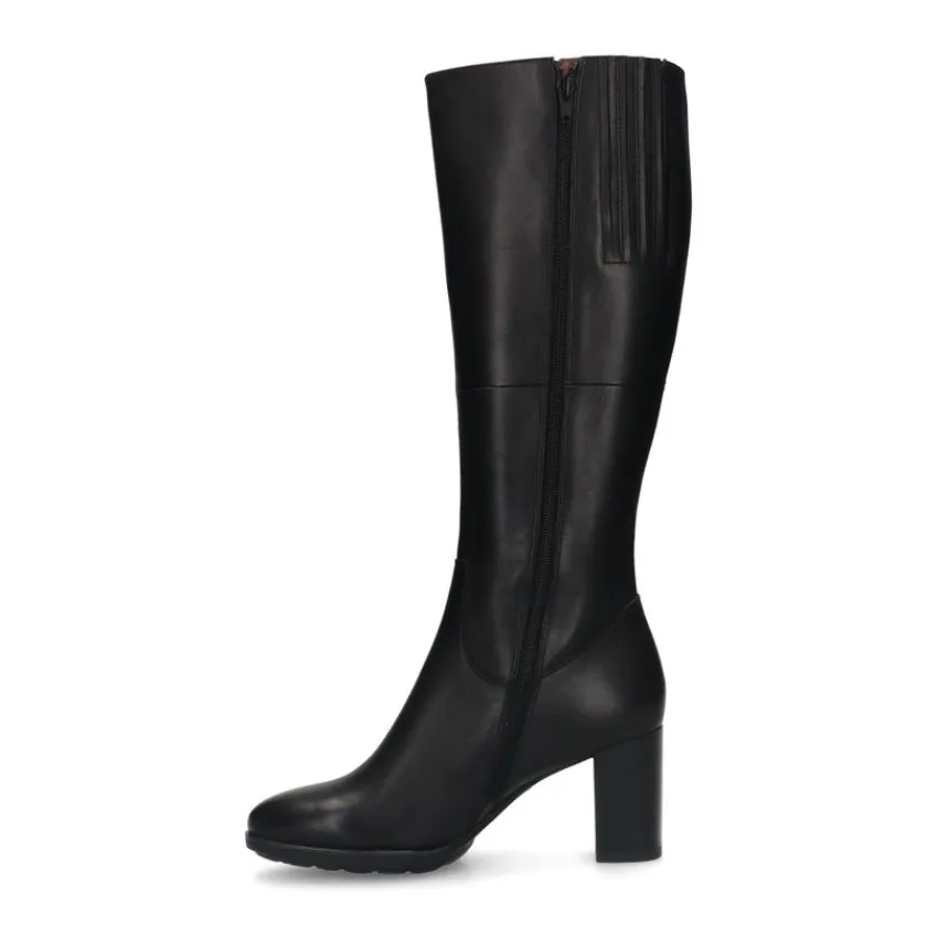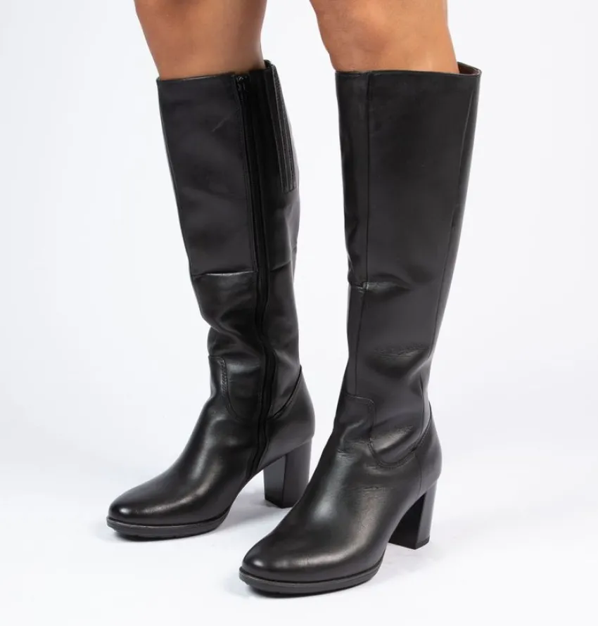 Zwarte leren hoge laarzen met hak van het merk No Stress. De laartzen hebben een memory foam voetbed, hak van 7 cm en ritssluiting aan de binnenzijde. De schachthoogte is 40 cm en de schachtbreedte is 38 cm. We adviseren als verzorging en bescherming de Collonil Carbon Pro.