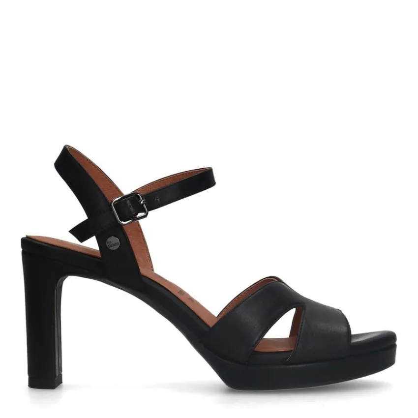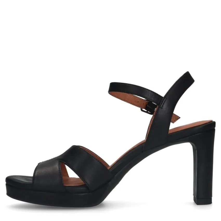 Zwarte leren sandalen met hak van het merk No Stress. De sandalen hebben een memory foam voetbed, hakhoogte van 8 cm, plateauzool van 2 cm en gespsluiting rondom de enkel. We adviseren als verzorging en bescherming de Collonil Carbon Pro.