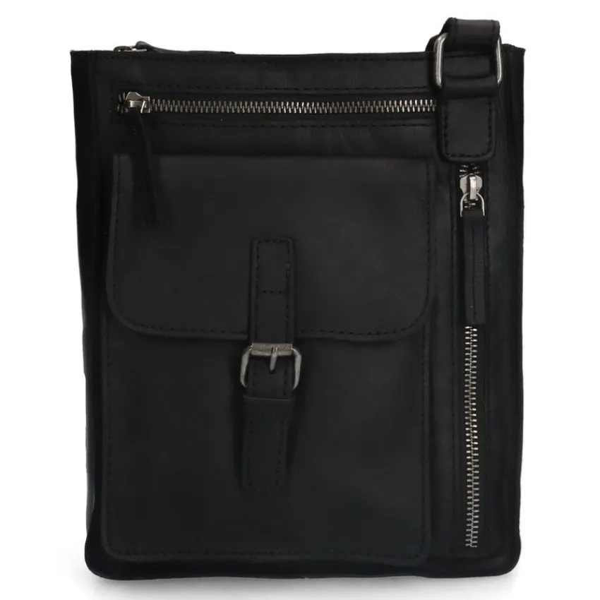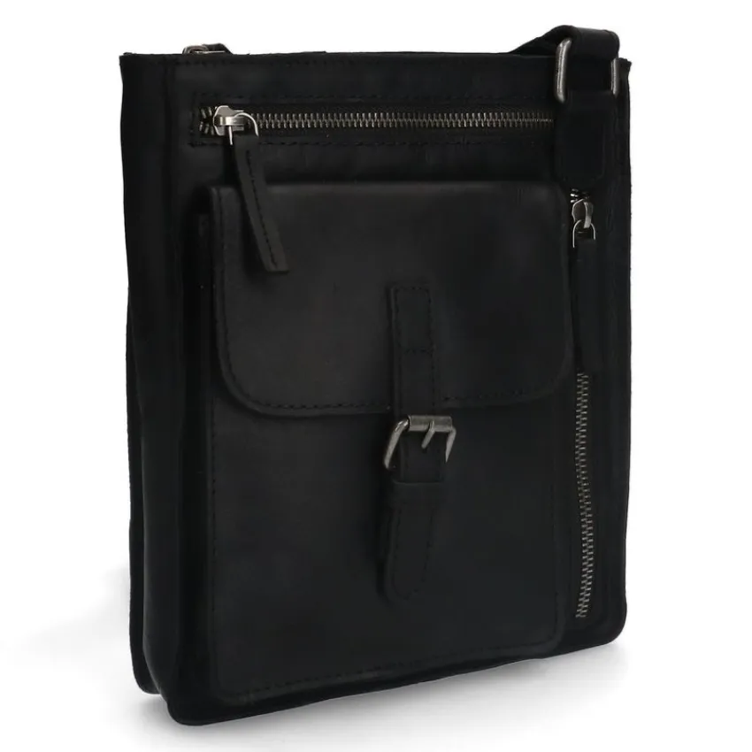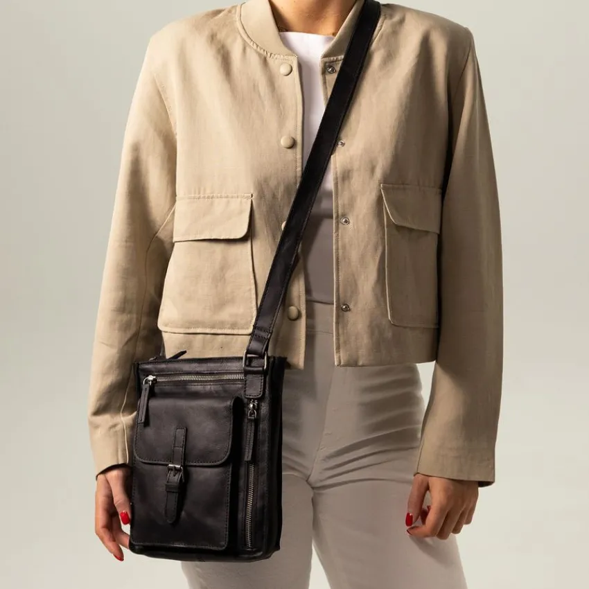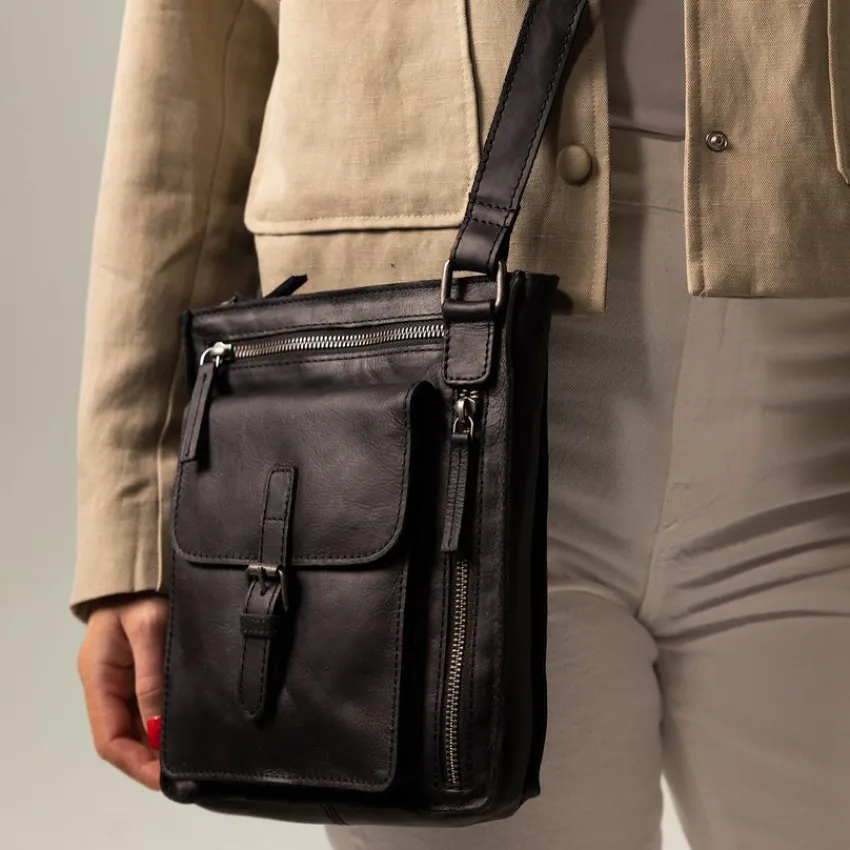 Zwarte leren schoudertas van het merk No Stress. De afmeting van deze tas is 20x24x5 cm (BxHxD), voorzien van meerdere aparte vakken die sluiten door middel van een ritssluiting. Ook zit er een verstelbare band bij van 135 cm. We adviseren als verzorging en bescherming de Collonil Carbon Pro.
