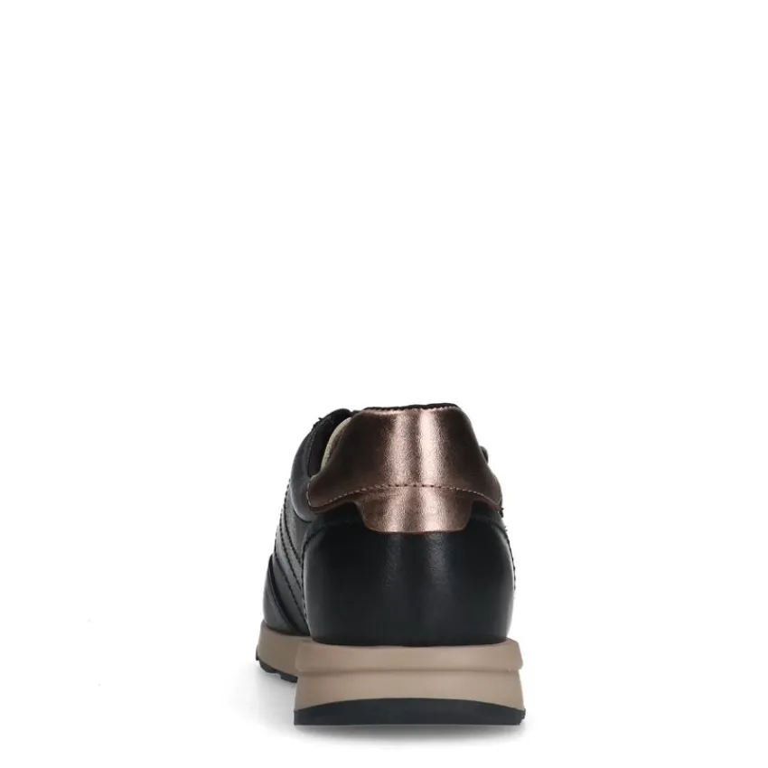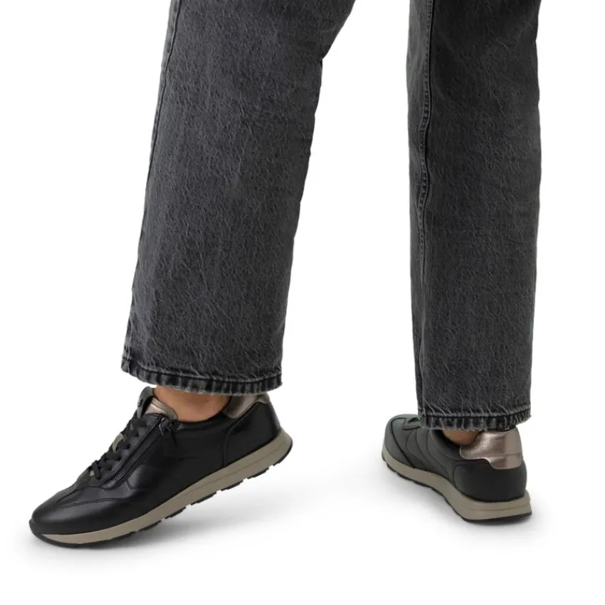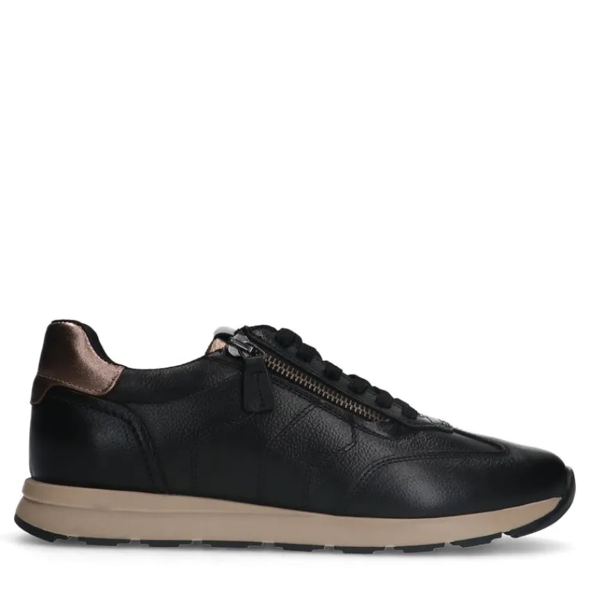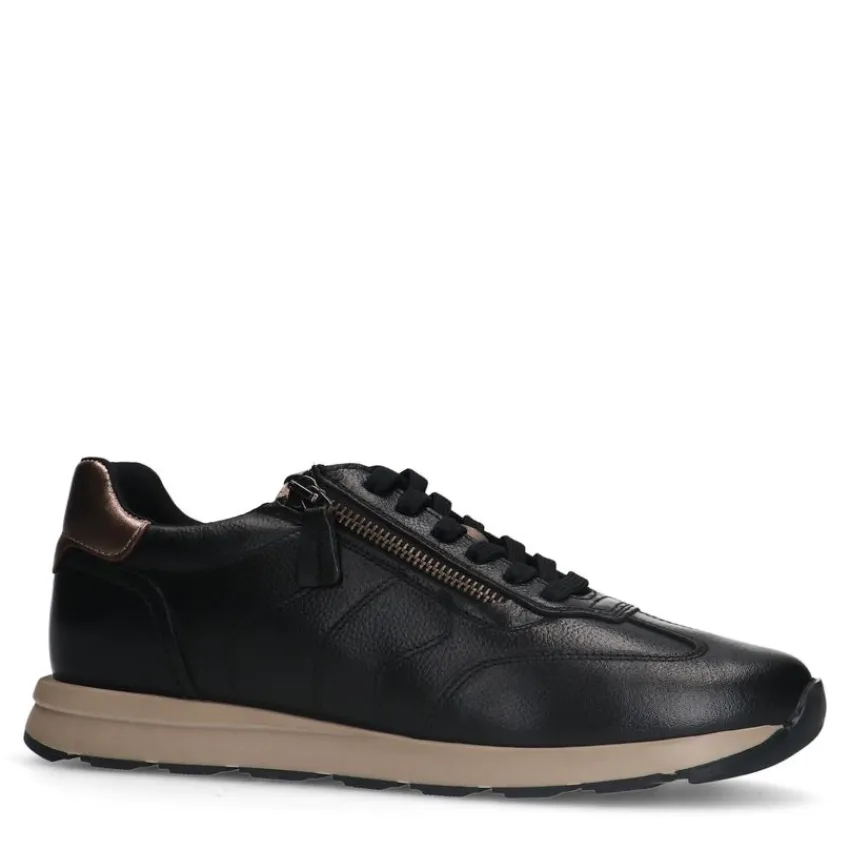 Zwarte leren sneakers met rits van het merk No Stress. De sneakers hebben een uitneembaar voetbed, een rits aan de zijkant en een vetersluiting. We adviseren als verzorging en bescherming de Collonil Carbon Pro.