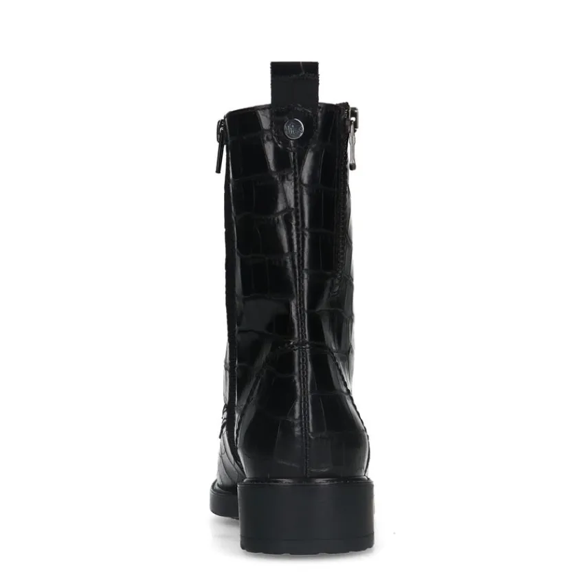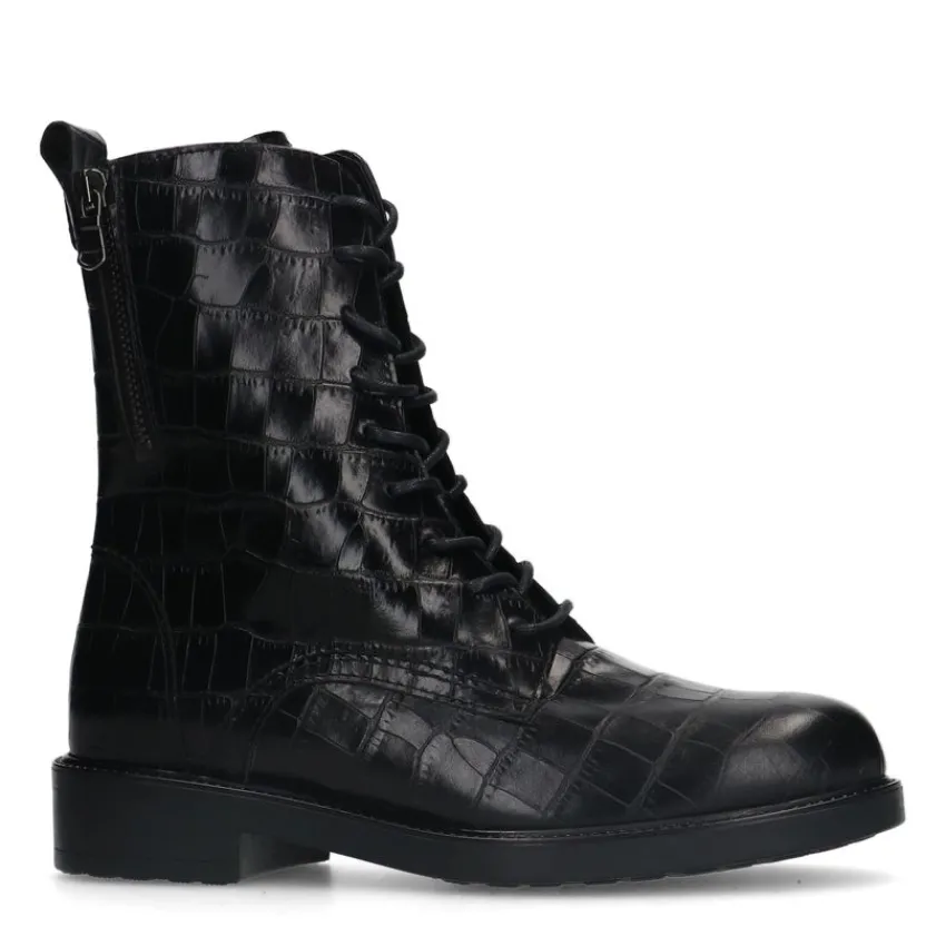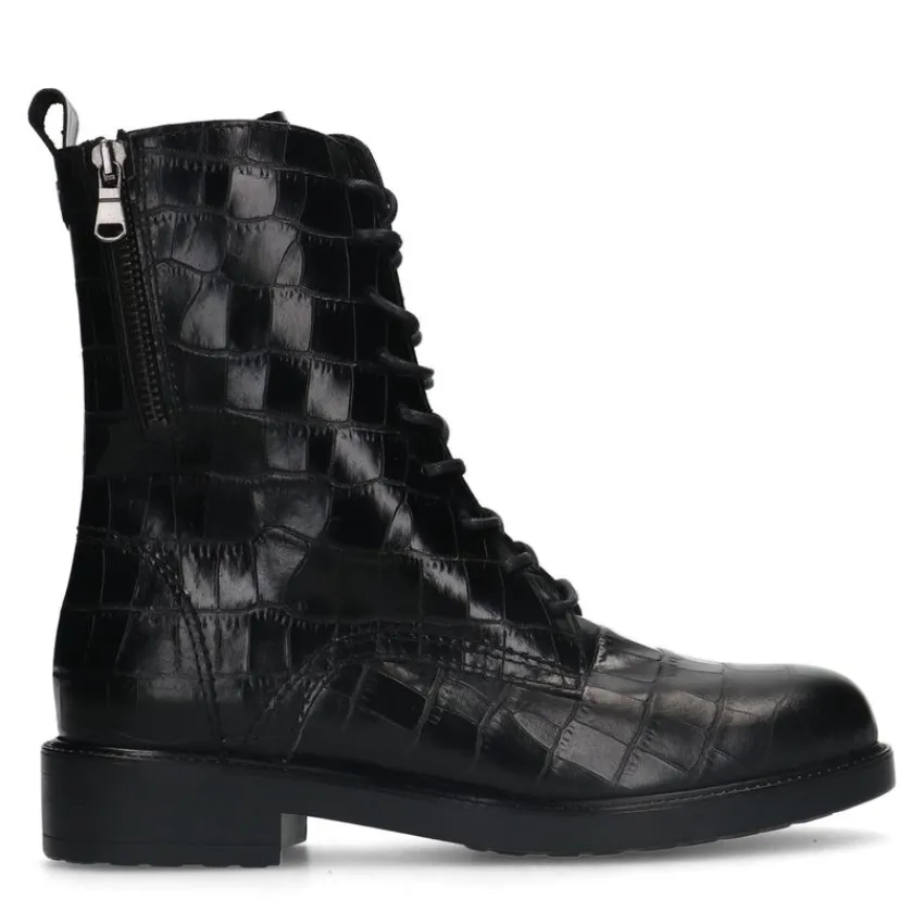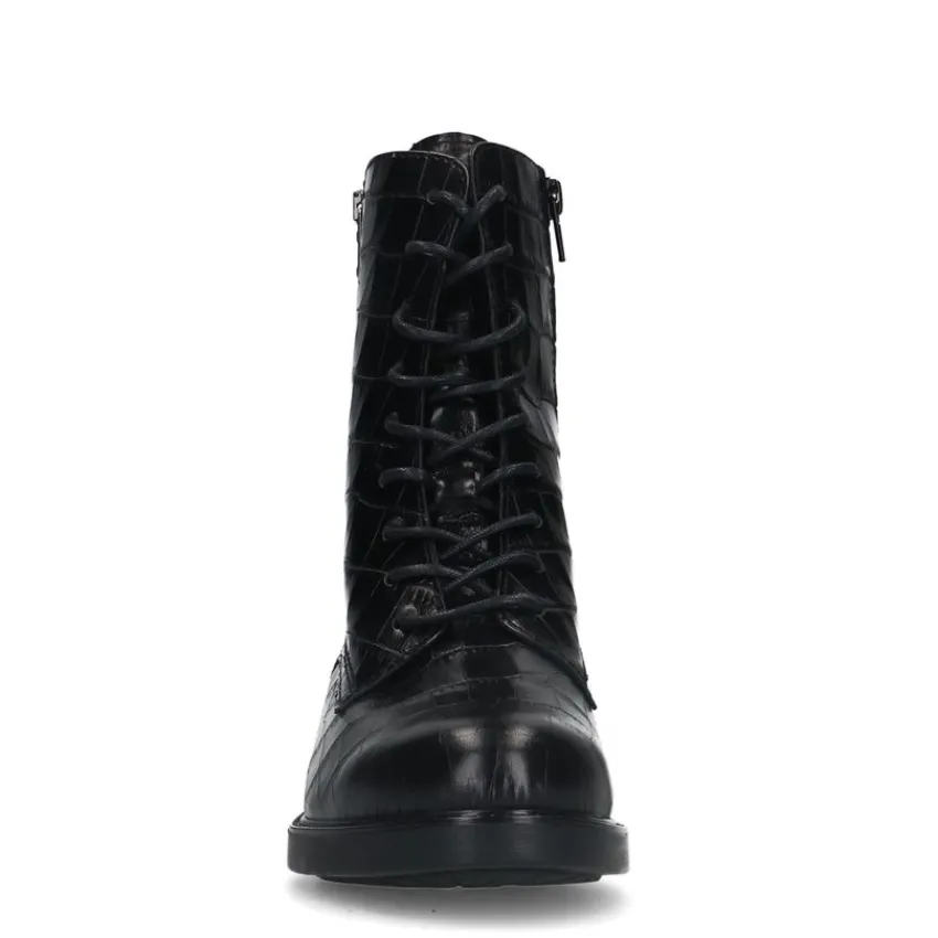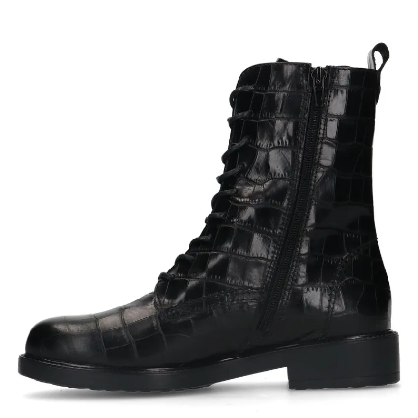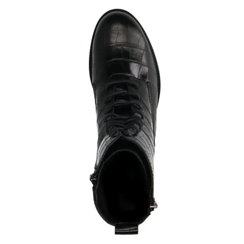 Zwarte leren veterlaarsjes van het merk No Stress met crocoprint, een memory foam voetbed, ritssluiting aan de binnenzijde en een platte hak van 3 cm. We adviseren als verzorging en bescherming de Collonil Carbon Pro.
