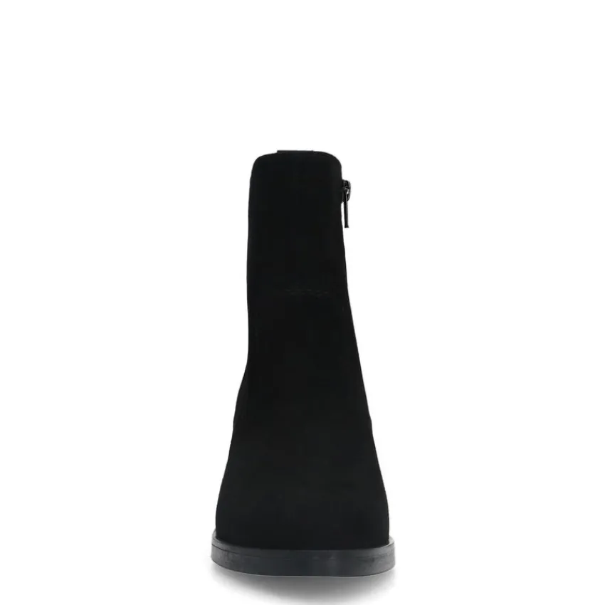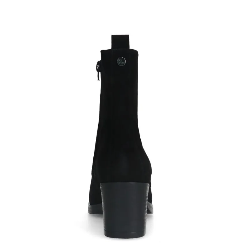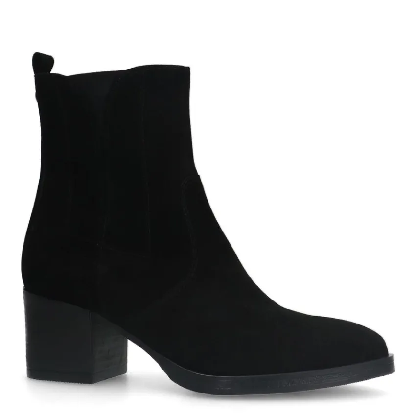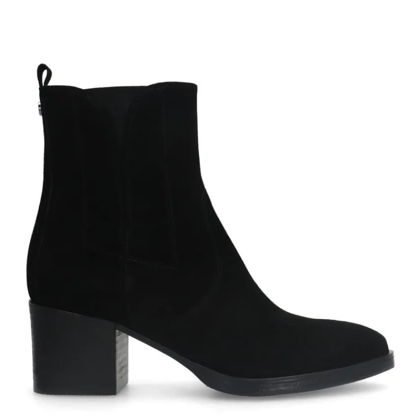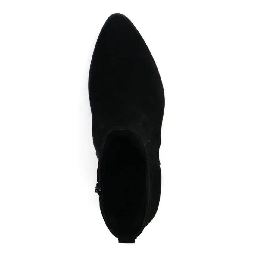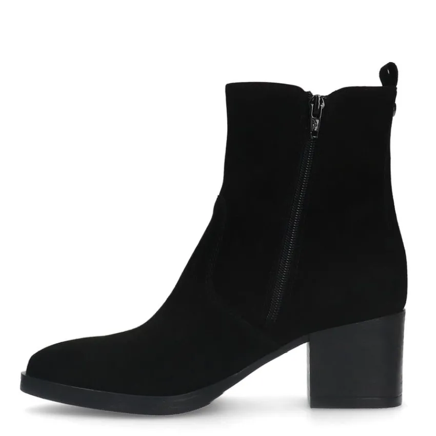 Zwarte suède enkellaarsjes met hak van het merk No Stress. De enkellaarsjes hebben aan de binnenzijde een ritssluiting, hebben een gevoerde binnenkant en een blokhak van 6 cm. . We adviseren als verzorging en bescherming de suède/nubuck spray in transparant.
