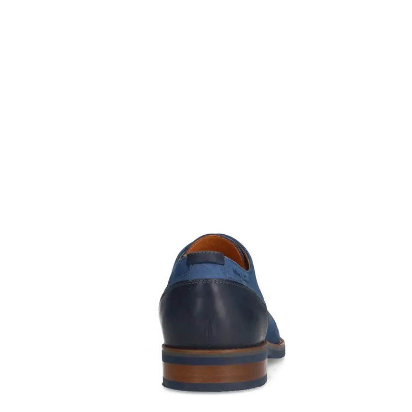 Blauwe nubuck veterschoenen van Van Lier met een platte hak van 2 cm en leren detail op de achterzijde. We adviseren als verzorging en bescherming de suède/nubuck spray in transparant.