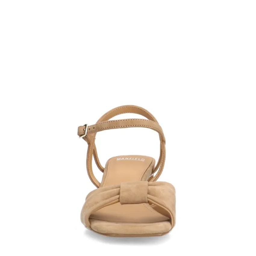 Beige suède sandalen met hak van Manfield. De sandalen hebben een strik detail, gespsluiting rondom de enkels en hakhoogte van 8 cm. We adviseren als verzorging en bescherming de suède/nubuck spray in transparant.