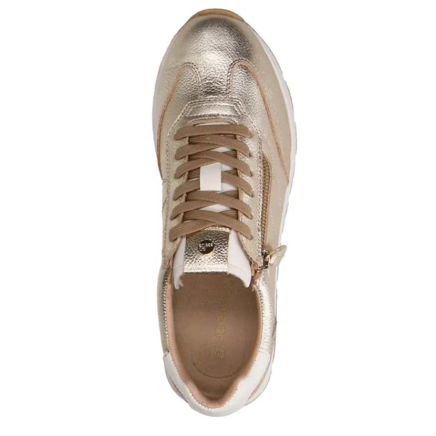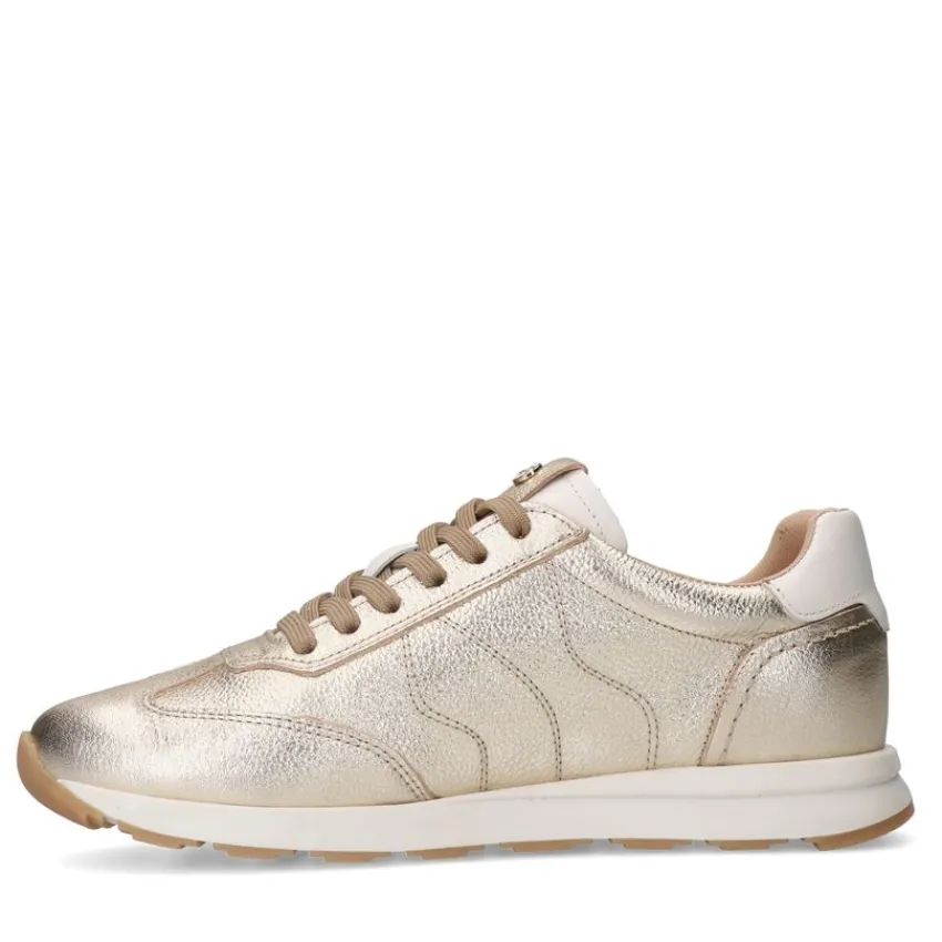 Gouden leren sneakers van het merk No Stress. De sneakers hebben een rits aan de zijkant en een vetersluiting. We adviseren als verzorging en bescherming de Collonil Carbon Pro.