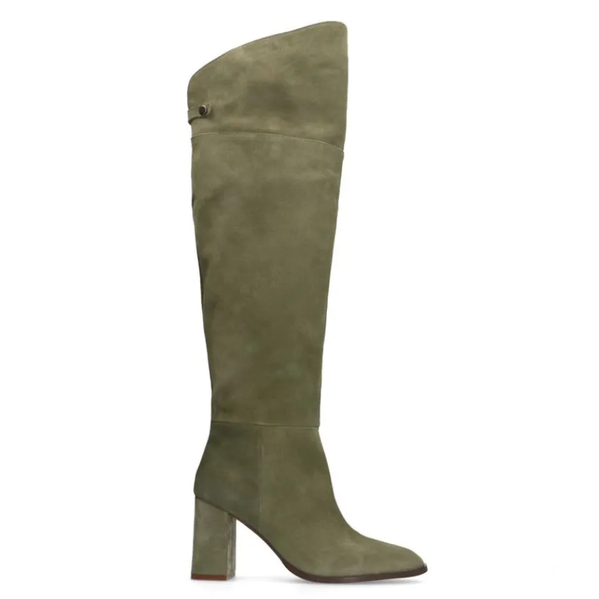 Groene suède hoge laarzen met hak van Manfield. De laarzen hebben een hakhoogte van 8 cm en ritssluiting aan de binnenzijde. De laarzen hebben een schacht omtrek van 40 cm, een schacht hoogte aan de voorkant van 53 cm een schacht hoogte aan de achterkant van 43 cm en een ronde neus. We adviseren als verzorging en bescherming de suède/nubuck spray in transparant.
