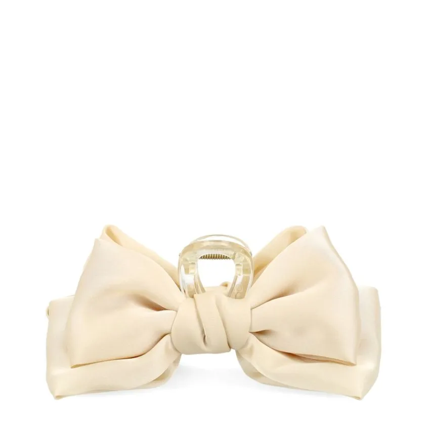 Beige haarklem met strik van Manfield. de klem is 11 cm breed en de strik is 14 cm breed.