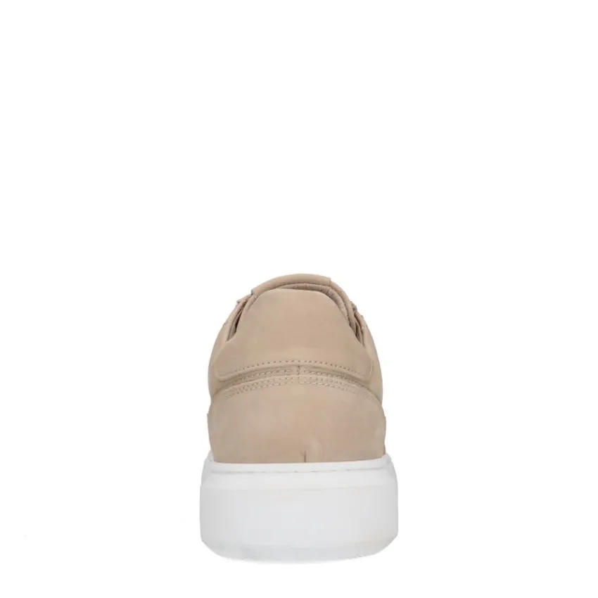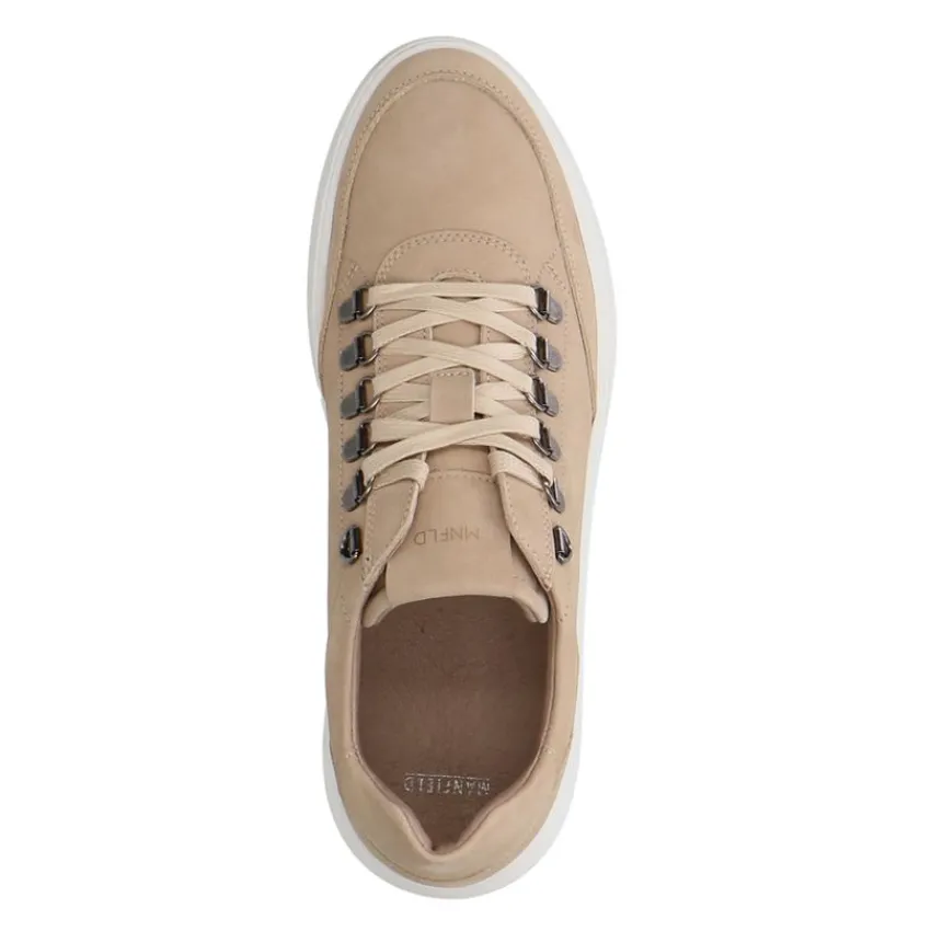 Beige nubuck sneakers van Manfield. Deze heren sneakers zijn gemaakt van nubuck en daarom raden we je aan deze herenschoenen te verzorgen en beschermen met de Suède/Nubuck spray in transparant. De hoge witte zool van 2 cm zorgt voor een sportieve en casual uitstraling.
