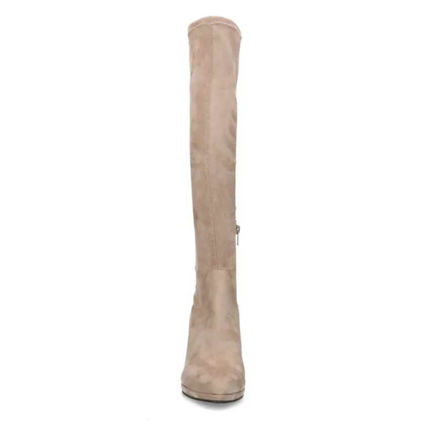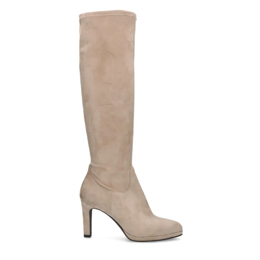 Beige suède stretch laarzen met hak van Manfield. De laarzen hebben een ritssluiting aan de binnenzijde. een hakhoogte van 9 cm en hebben een puntige neus. De schachthoogte is 45 cm en de schachtbreedte is 42 cm, gemeten bij een maat 37. We adviseren als verzorging en bescherming de suède/nubuck spray in transparant.