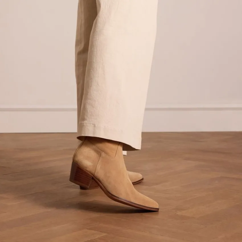 Beige suède enkellaarsjes met hak van Manfield. De enkellaarsjes hebben een rits aan de binnenzijde en een schuin afgesneden blokhak van 5 cm. We adviseren als verzorging en bescherming de suède/nubuck spray in transparant.