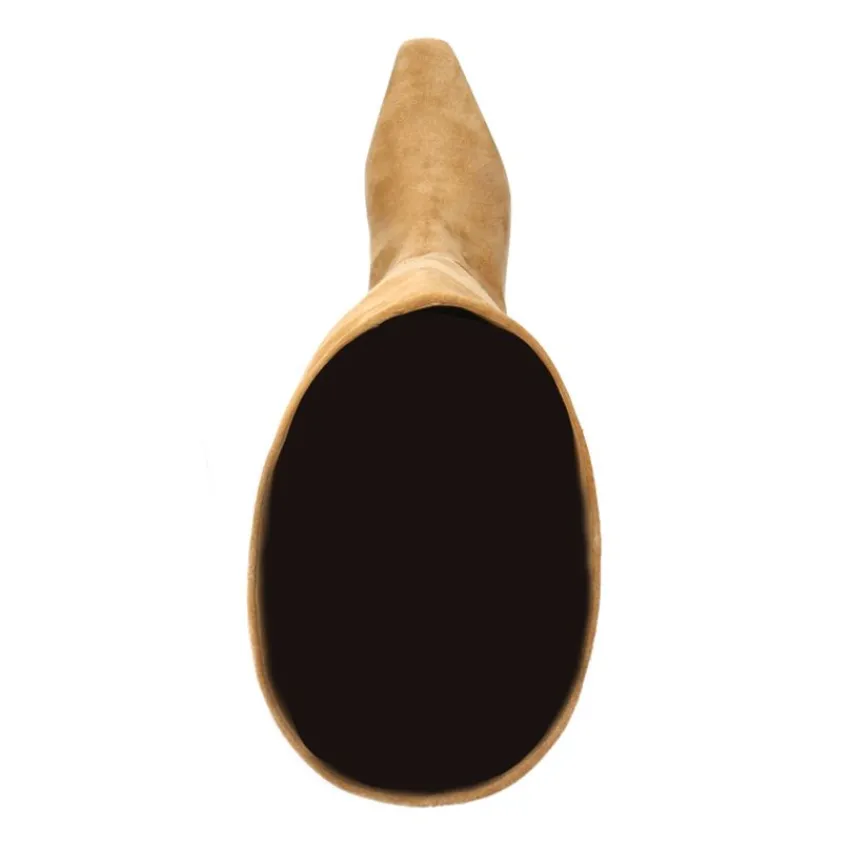 Beige suède hoge laarzen met hak van Manfield. De laarzen hebben een vierkante neus en een hak van 5 cm. De schachthoogte is 45 cm en de schachtomtrek bedraagt 38 cm, gemeten bij een maat 37. We adviseren als verzorging en bescherming suède/nubuck spray in transparant.