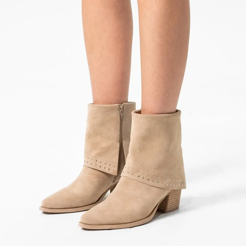 Beige suède overslaglaars met gouden studs van Manfield. De laars heeft een hak van 6 cm en puntige neus. We adviseren als verzorging en bescherming de suède/nubuck spray in transparant.