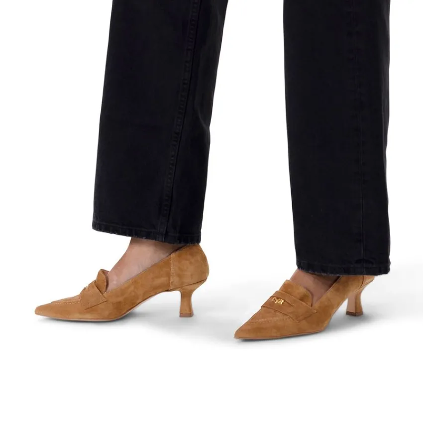 Beige suède pumps van Manfield met puntneus, hak van 6 cm en munt detail op de voorvoet. We adviseren als verzorging en bescherming de suède/nubuck spray in transparant.