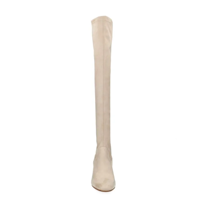 Beige suèdine overknee laarzen met hak van Manfield. De laarzen hebben een ritssluiting aan de binnenzijde. een hakhoogte van 6,5 cm en hebben een ronde neus. De schachthoogte is 50 cm en de schachtbreedte is 38 cm, gemeten bij een maat 37. We adviseren als verzorging en bescherming de suède/nubuck spray in transparant.