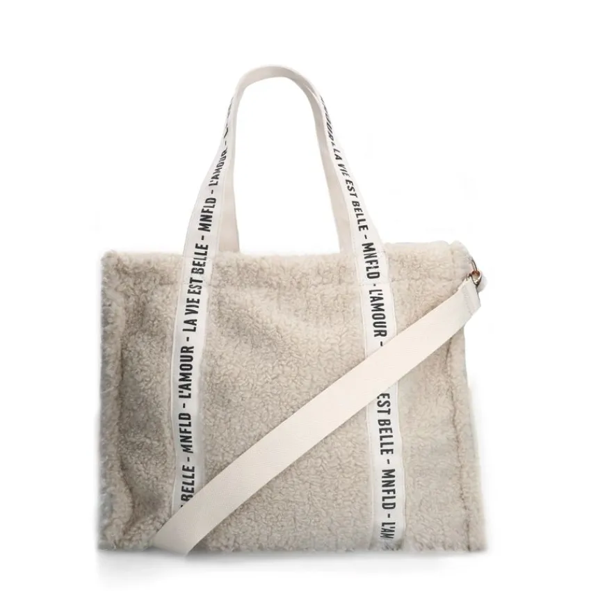 Beige teddy shopper van Manfield. De afmeting van deze tas is 43x36x19 cm (BxHxD). De tas is voorzien van een goudkleurige ritssluiting en een verstelbare beige strap waardoor je hem op meerdere manieren kan dragen.