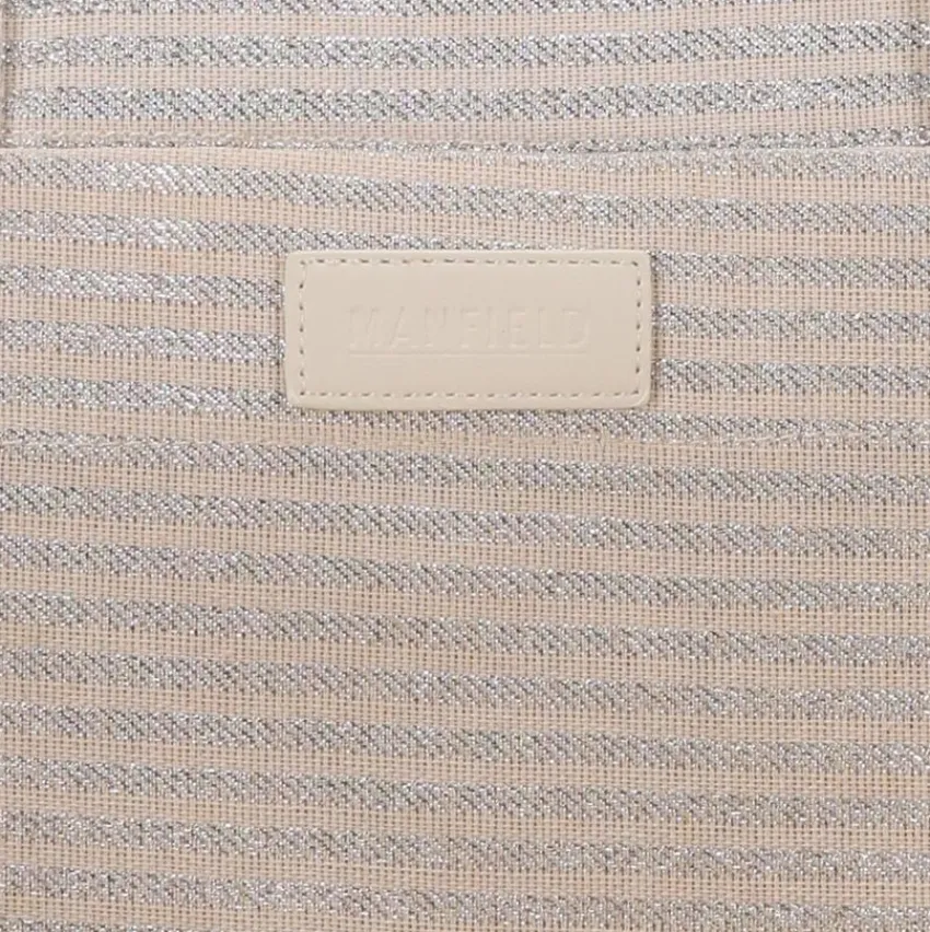 Beige & zilver gestreepte shopper van Manfield met dubbele handvaten. De afmeting van de shopper is 39x41x30 cm, (BxHxD).